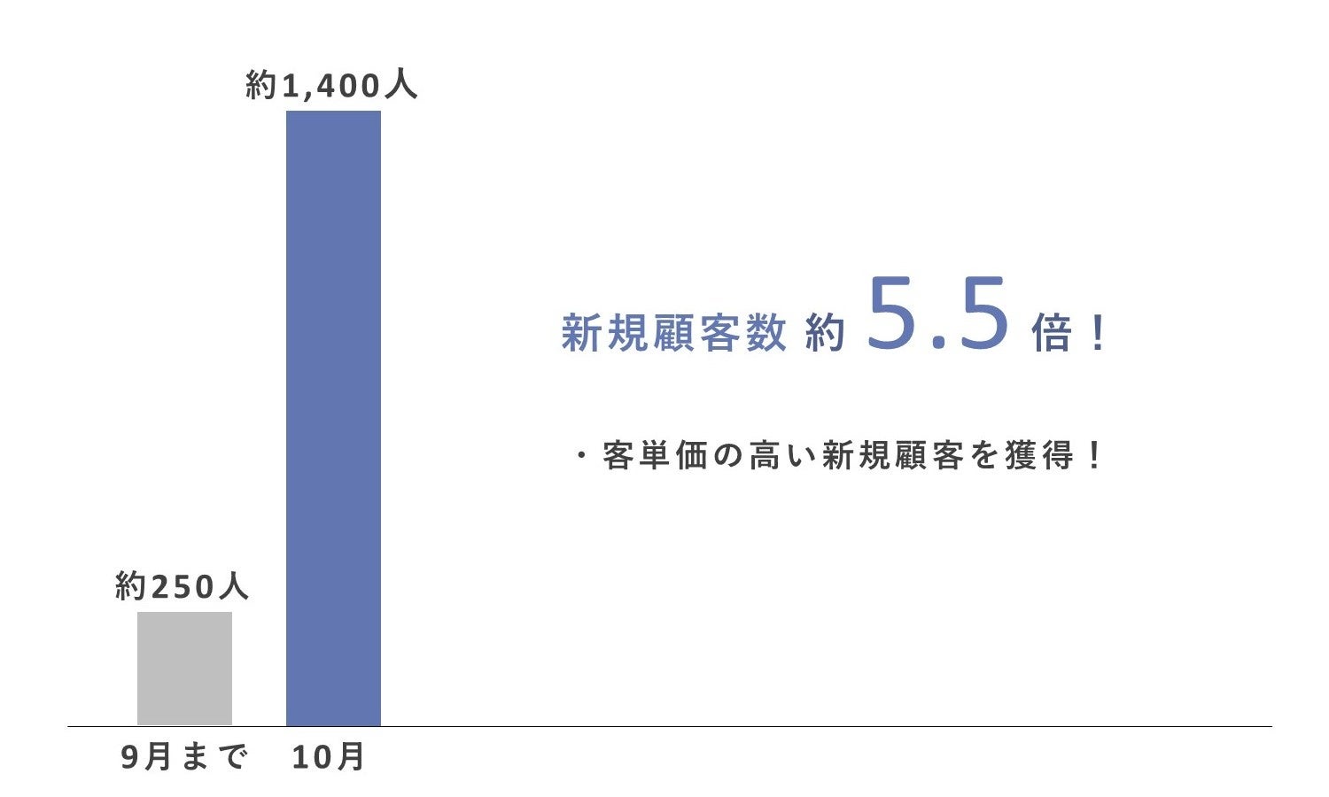 9月までの新規顧客数は毎月平均して250人程度でしたが、『100日連続朝配信』を開始して以降、10月は月間約1,400人の新規顧客の獲得に成功。9月までと比較して新規顧客数は約5.5倍に拡大しています。また、アヒルのライブマーケットでも、朝配信をきっかけに商品を購入されるようになったお客様は客単価が高い傾向となっています。