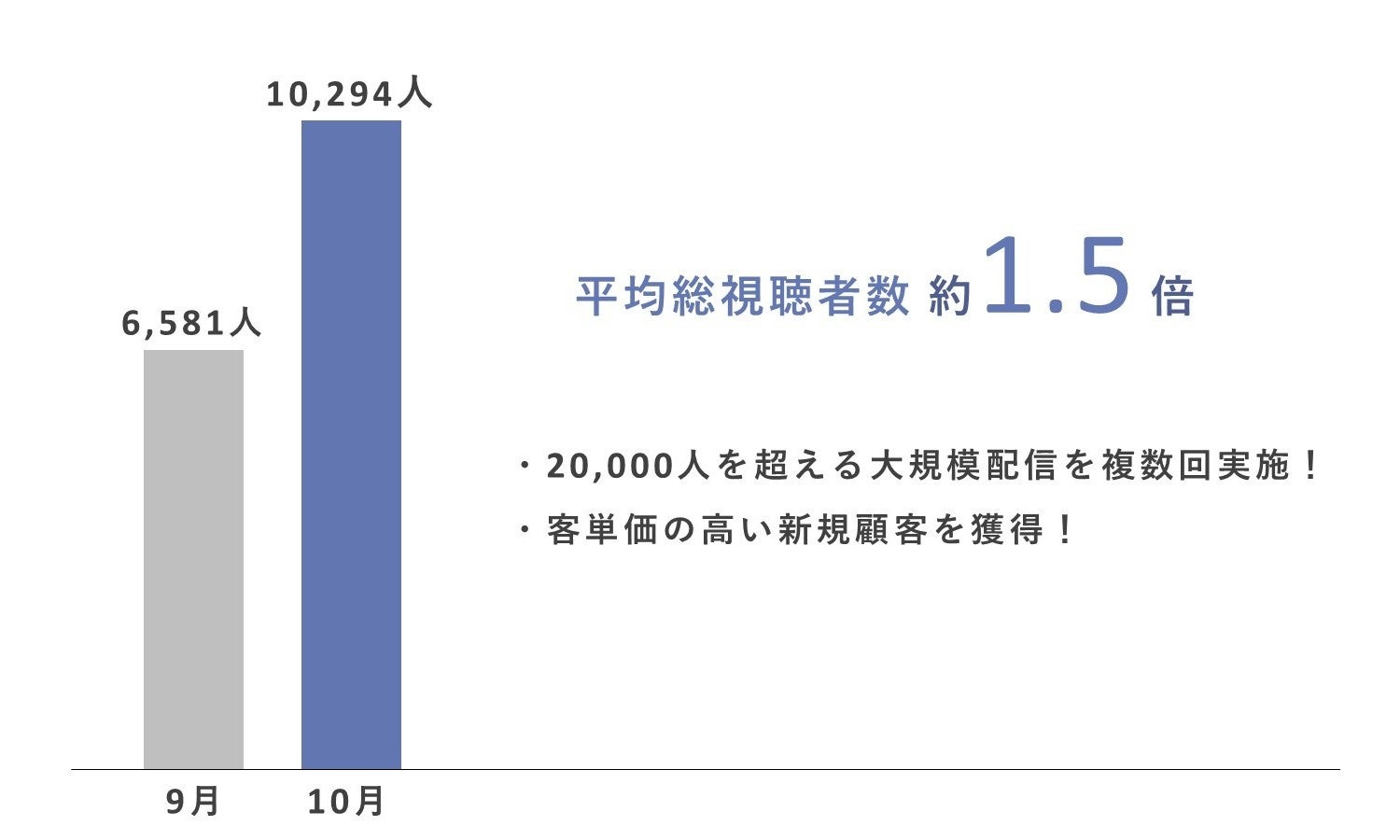 このたび10月度の月間売上1億3,000万円を突破した要因として、視聴者の朝のスキマ時間を狙った「朝配信」や、ライブコマーサーのリブランディングなどの新施策により新顧客の獲得や顧客単価の増加に繋がったことが挙げられます。