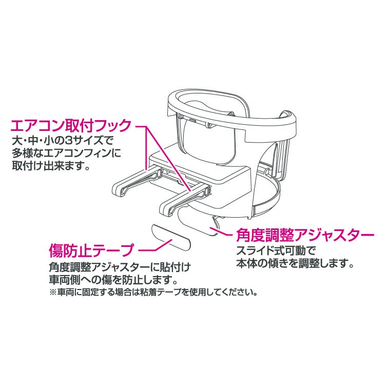 車両のエアコンに取り付けることでドリンクホルダーを増設できます。