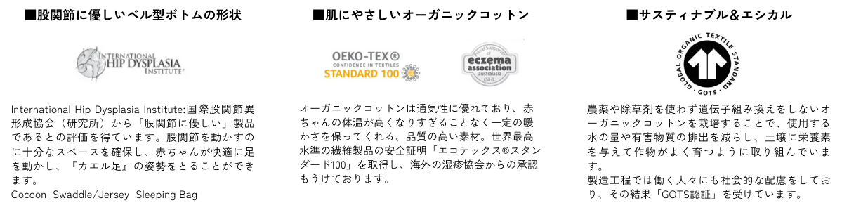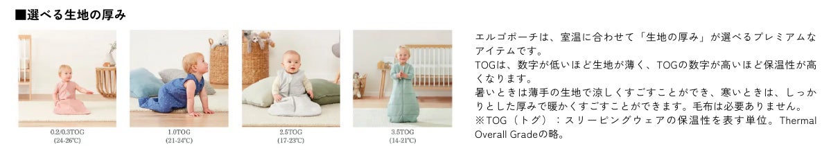 またスリープウェアは、人間工学に基づきデザインされており、特に睡眠のお悩みが絶えない新生児から成長に合わせて段階的に、すべてのお子さんが安全に眠れるように準備されています。