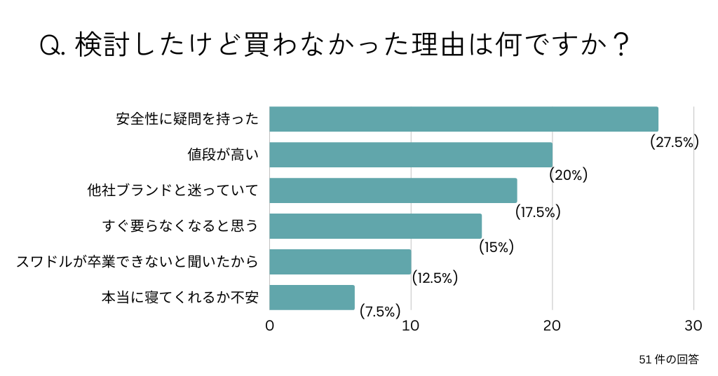 その理由としては、「安全性に疑問を持った」「本当に寝てくれるか不安」などの使用感への不安の回答が最多で、「値段が高い」といった価格で検討しているママの意見も寄せられました。