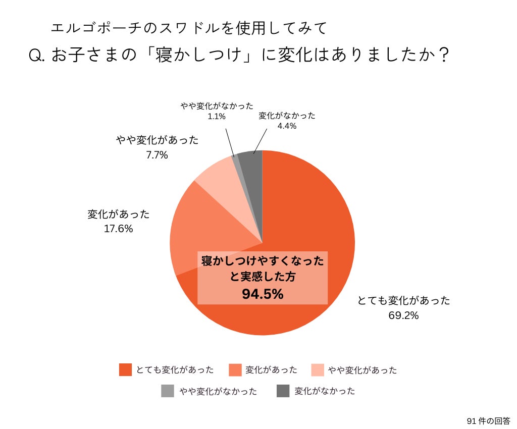 エルゴポーチのスワドルを使用してみて、お子さまの寝かしつけに変化はありましたか?の設問に対し5段階評価で回答頂いた結果、「寝かしつけやすくなった」と実感した方が、なんと94.5%にも上りました。