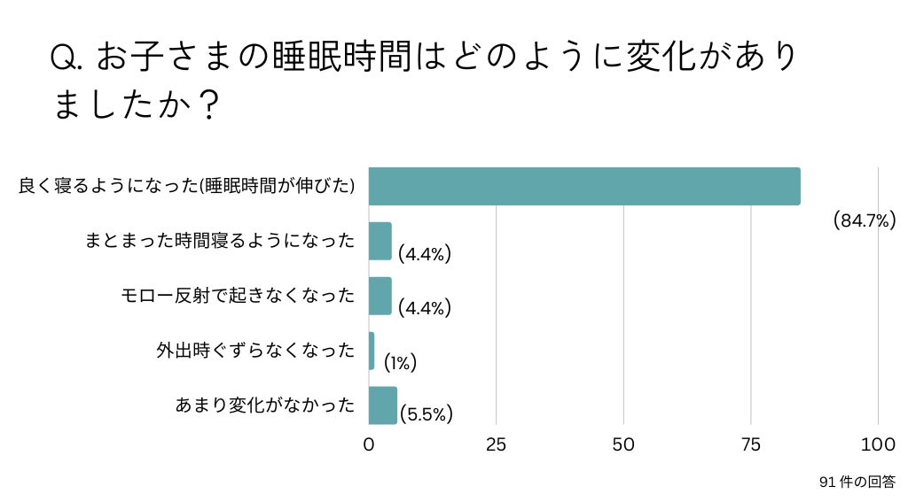 使用後の具体的な変化では「よく寝るようになった(睡眠時間が伸びた)」の回答が84.7%のダントツ1位の結果に。