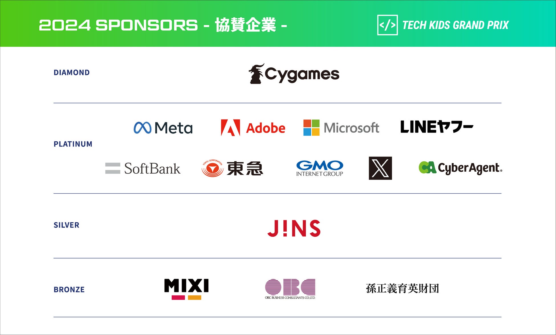 株式会社Cygames、Facebook Japan株式会社、アドビ株式会社、日本マイクロソフト株式会社、LINEヤフー株式会社、ソフトバンク株式会社、東急株式会社、GMOインターネットグループ株式会社、Twitter Japan株式会社、株式会社サイバーエージェント、株式会社ジンズ、株式会社MIXI、株式会社オービックビジネスコンサルタント、公益財団法人 孫正義育英財団、コカ・コーラ ボトラーズジャパン株式会社、株式会社プログラミング総合研究所、株式会社ディー・エヌ・エー、株式会社キュレオ