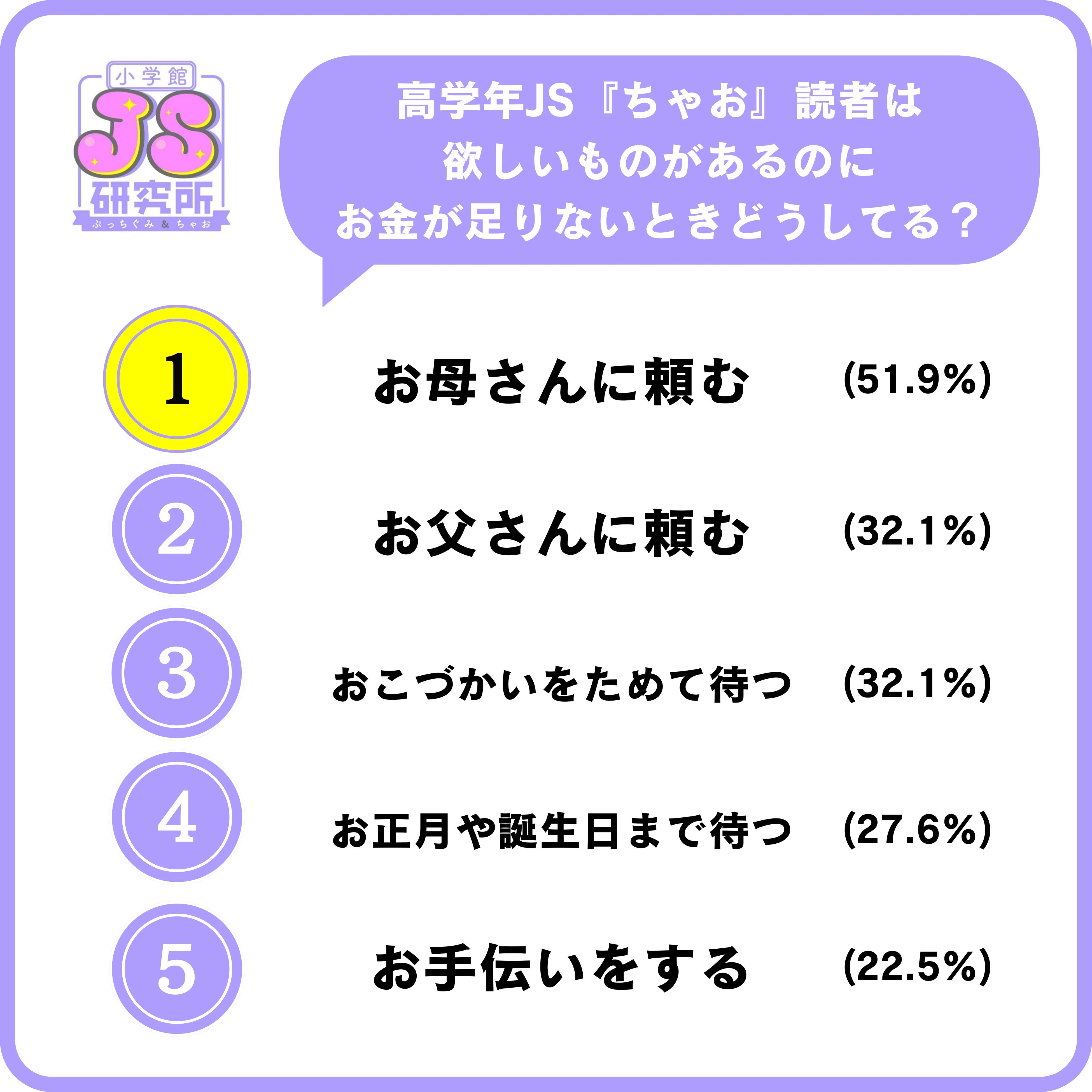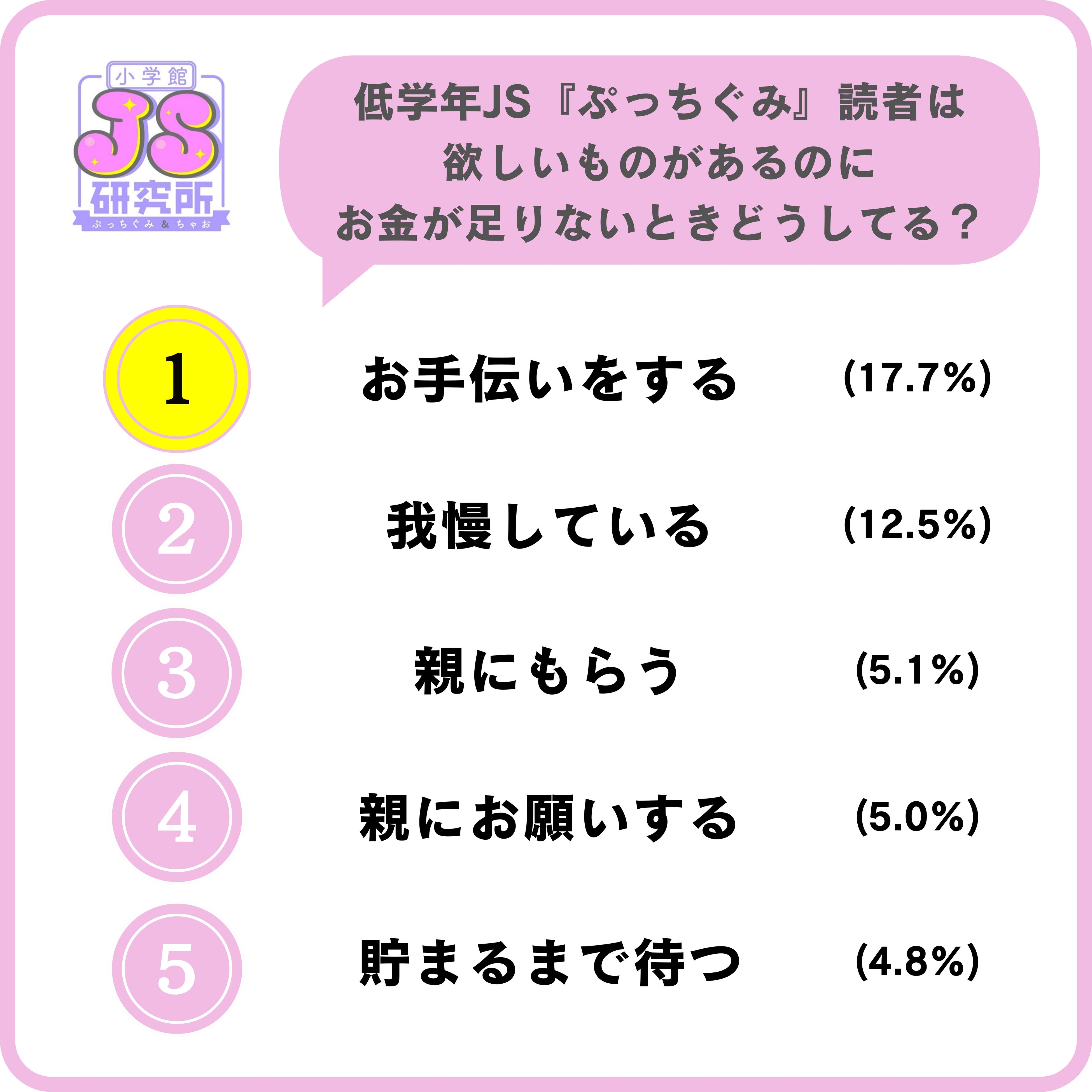 【小学館JS研究所】女子小学生のおこづかい事情お金が足りない時はどうする?低学年1位「お手伝い」、高学年1位「お母さんに頼む」高学年ではフリマという選択肢も