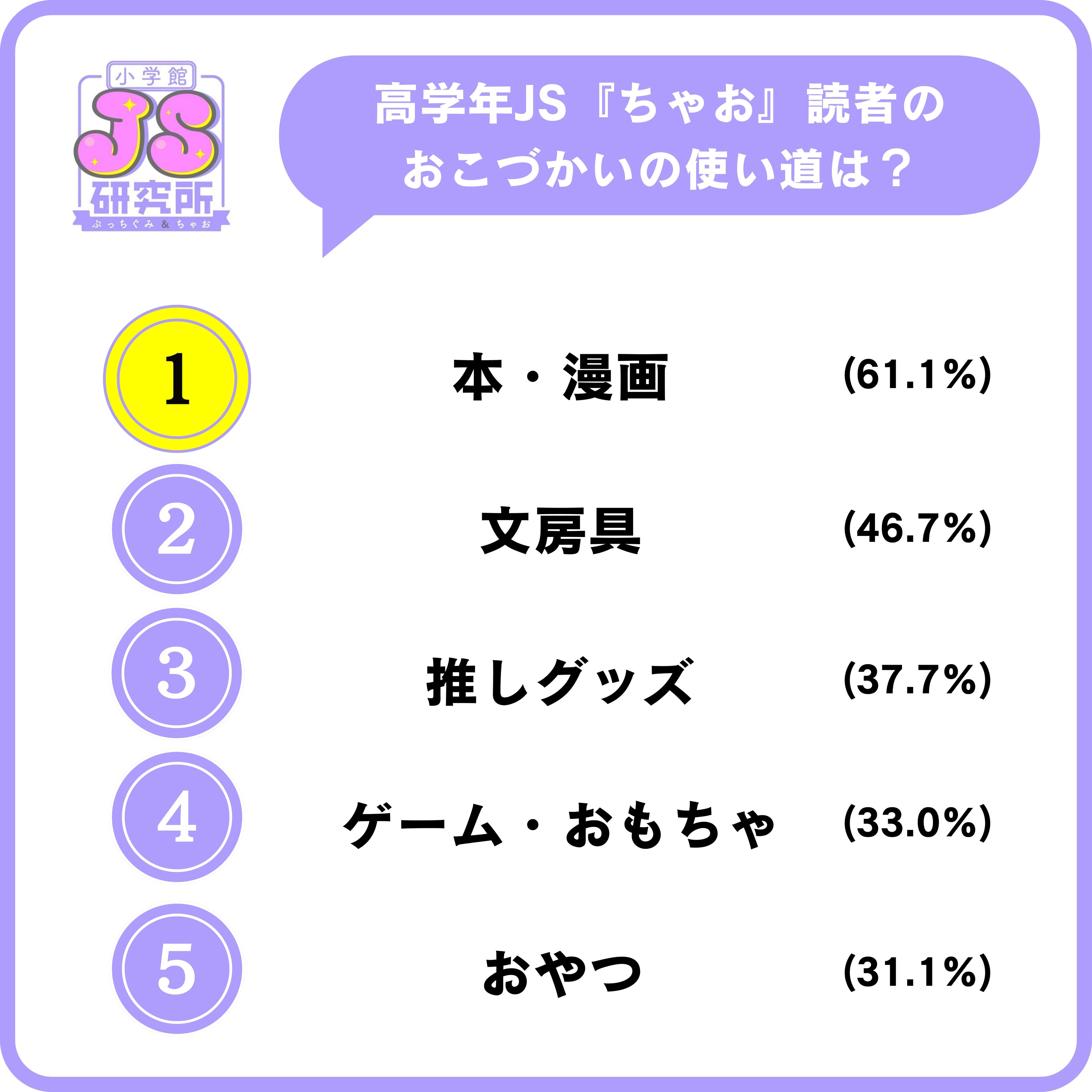 今回、低学年JS向けの『ぷっちぐみ』2025年12・1月号と、高学年JSがメイン読者層の『ちゃお』2025年11月号にて各1000名の読者を対象に実施した「おこづかい」に関するアンケート調査の結果を、「欲しいものがあるのにお金が足りない時の対処法」「貯金」に関する調査結果とともに比較・分析。その結果、低学年JSと高学年JSのおこづかいの使い道やお金の捻出方法などの違いが明らかになりました。