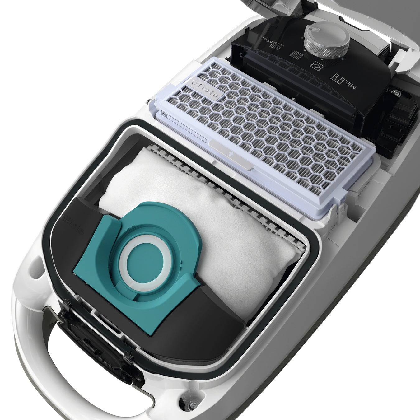 衛生面においては、集めたゴミが掃除機内にこぼれないようにダストバッグが掃除機本体にしっかりとフィットする新開発の「ComfortFit(コンフォートフィット)」を採用。この新構造に伴い、ダストバッグも新形状の「HyClean Pure TU」に進化しました。Miele独自のAirCleanシステムによる高い空気ろ過性能に加え、ゴミ捨て時に自動で閉じるフタを備えることで、ダストバッグ交換時にホコリやチリの舞い上がりを抑制する機能はそのままに、再生プラスチックを80%使用しており環境への配慮も高めています。