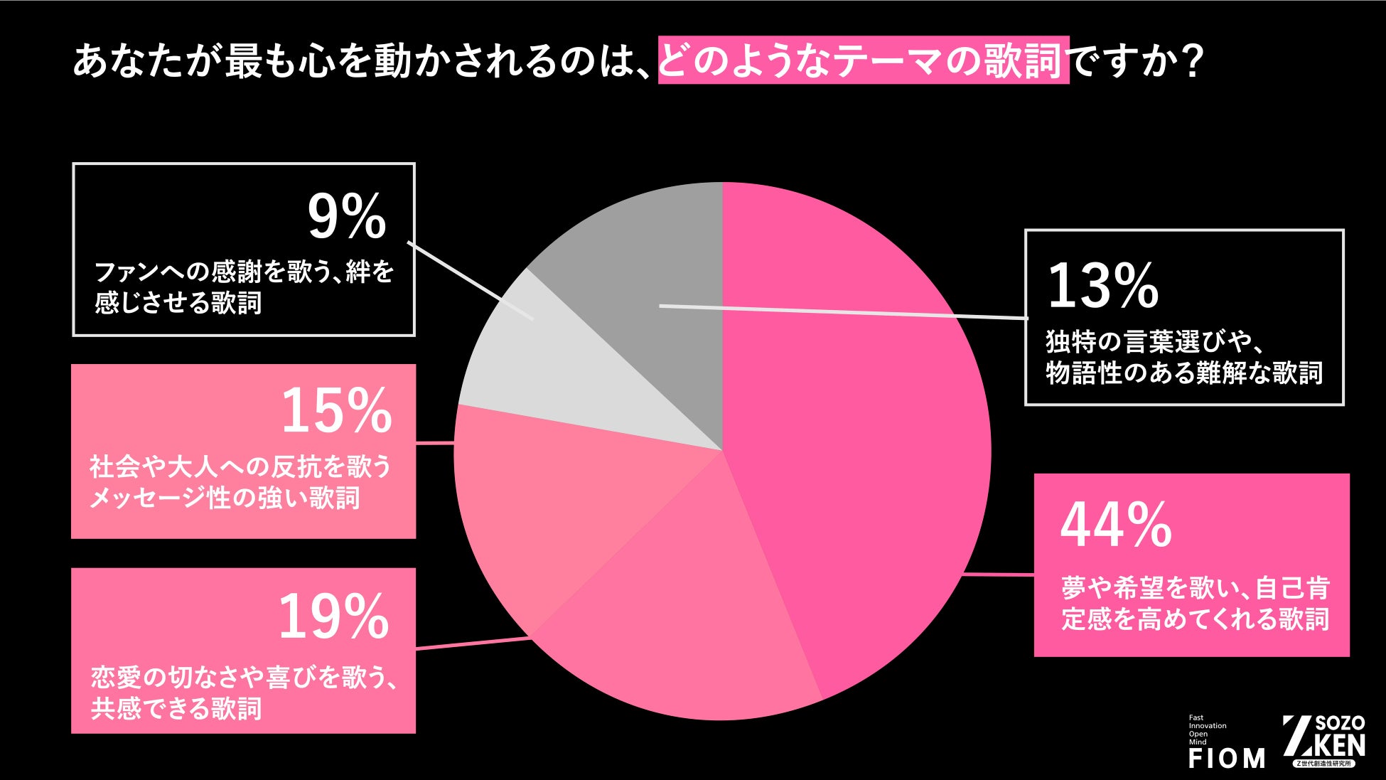 最も心を動かされる歌詞のテーマは、「夢や希望を歌い、自己肯定感を高めてくれる歌詞」(44%) がトップ。「恋愛」(19%) に大差をつけました。