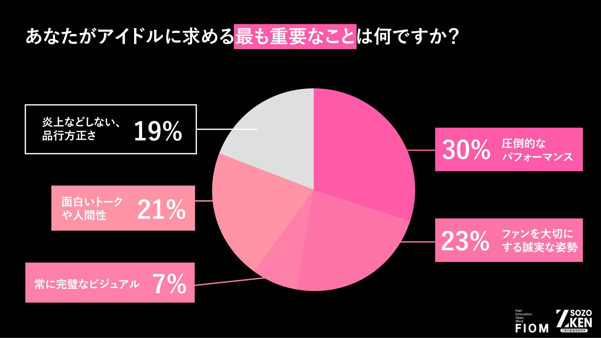 アイドルに求める最も重要なことは「圧倒的なパフォーマンス」(30%) がトップ。「ファンを大切にする誠実な姿勢」(23%)、「面白いトークや人間性」(21%) が続き、「常に完璧なビジュアル」は7% に留まりました。