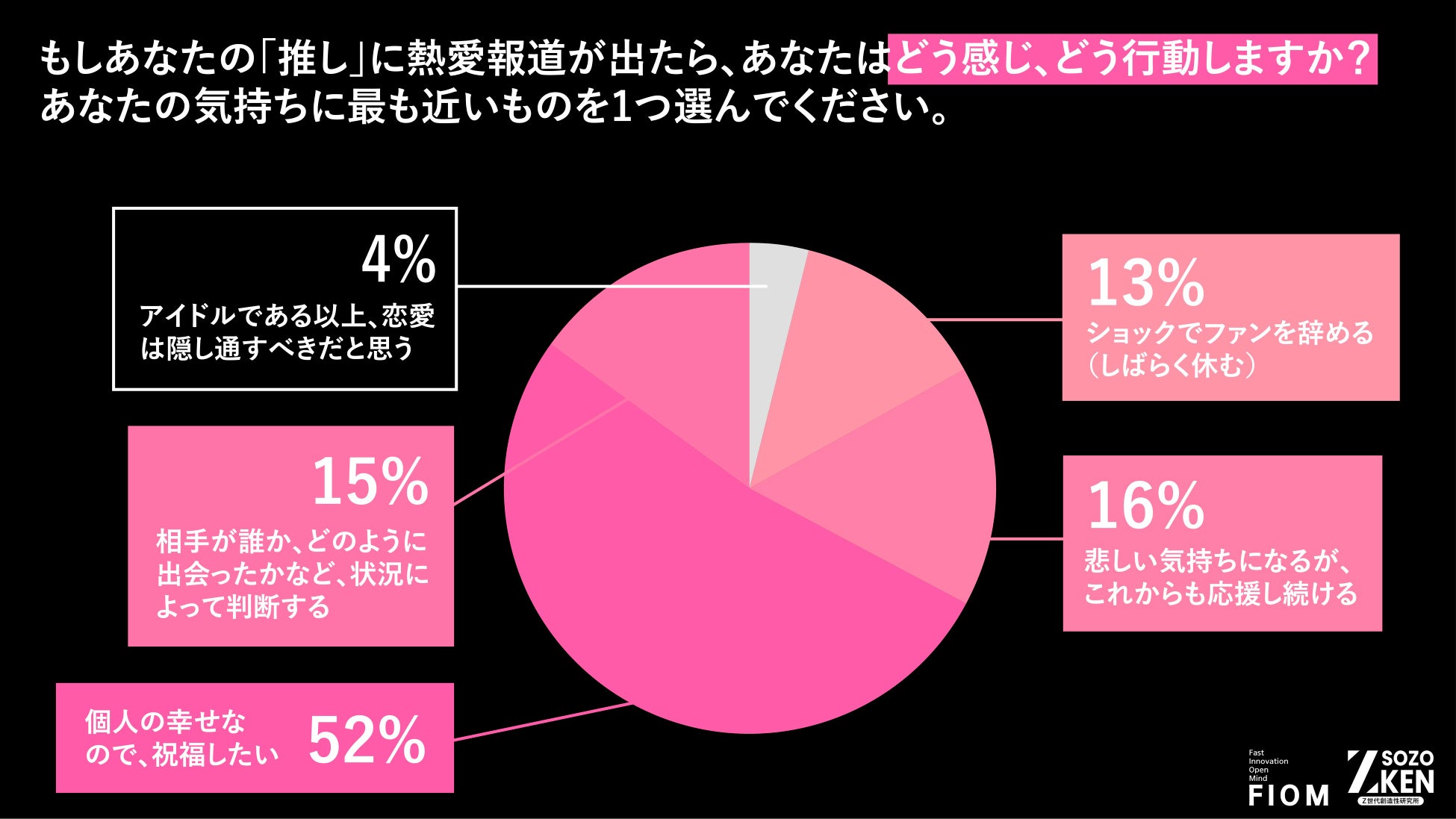 「推し」の熱愛報道に対し、「個人の幸せなので、祝福したい」が52% 。アイドルのプライベートな幸せを尊重する価値観が示されました。
