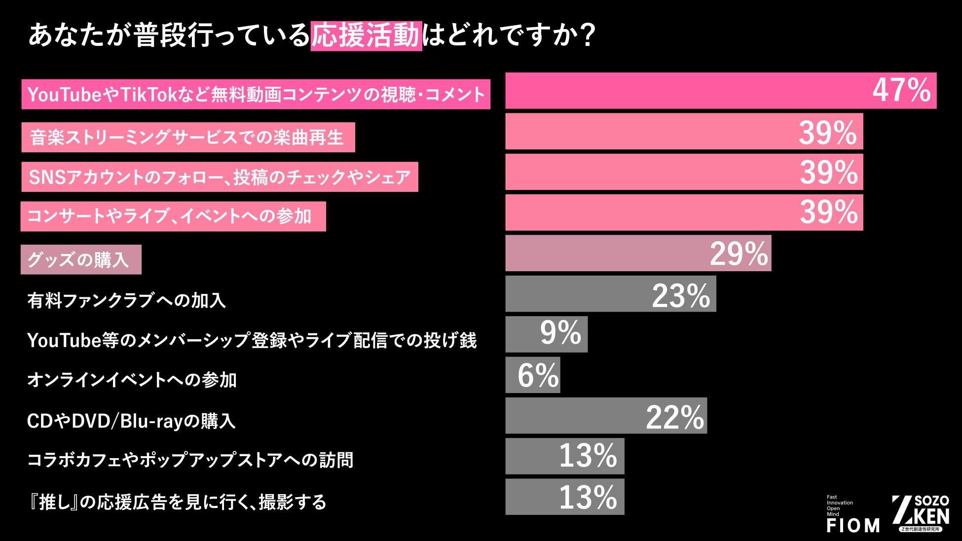 応援は「金」より「拡散」。Z世代の応援活動の1位は「無料動画の視聴・コメント」(47%)。