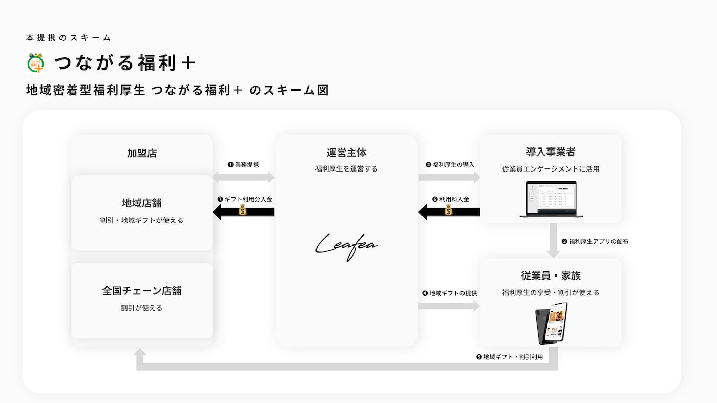 リーフィが提供する地域密着型福利厚生サービス(専用アプリ名称:「つながる福利+」)は、第三の賃上げと言われる企業の従業員向け福利厚生の充実のため、アプリを通じて従業員へのギフト還元や従業員の家族も利用できるクーポンの提供、および導入いただいた企業で働く従業員の働きがいやエンゲージメント向上を支援する内容となっています。