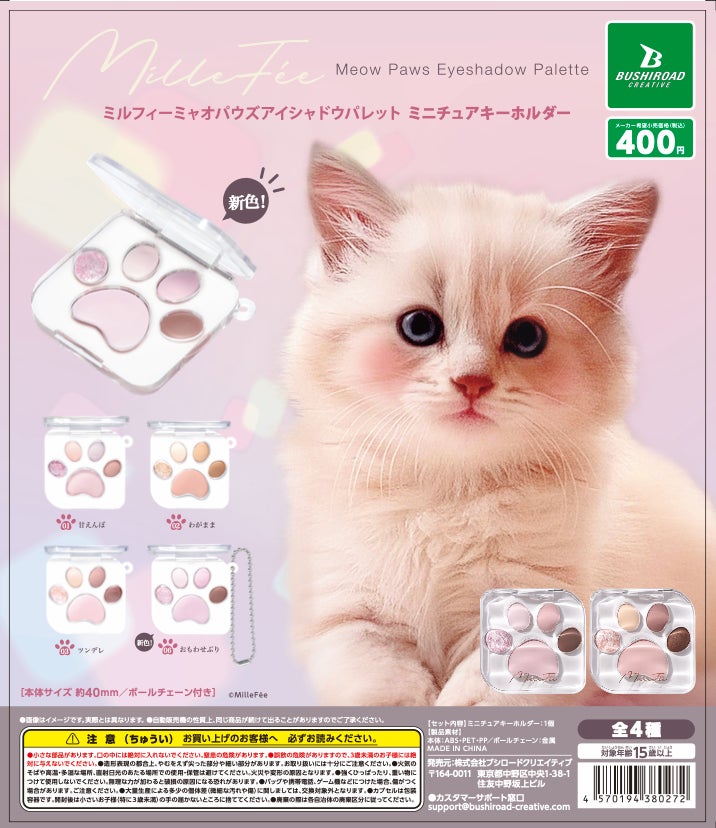ミャオパウズアイシャドウパレットを1点以上ご購入いただくと、「ミルフィーミャオパウズアイシャドウパレット ミニチュアキーホルダー」のカプセルトイが1回まわせます。