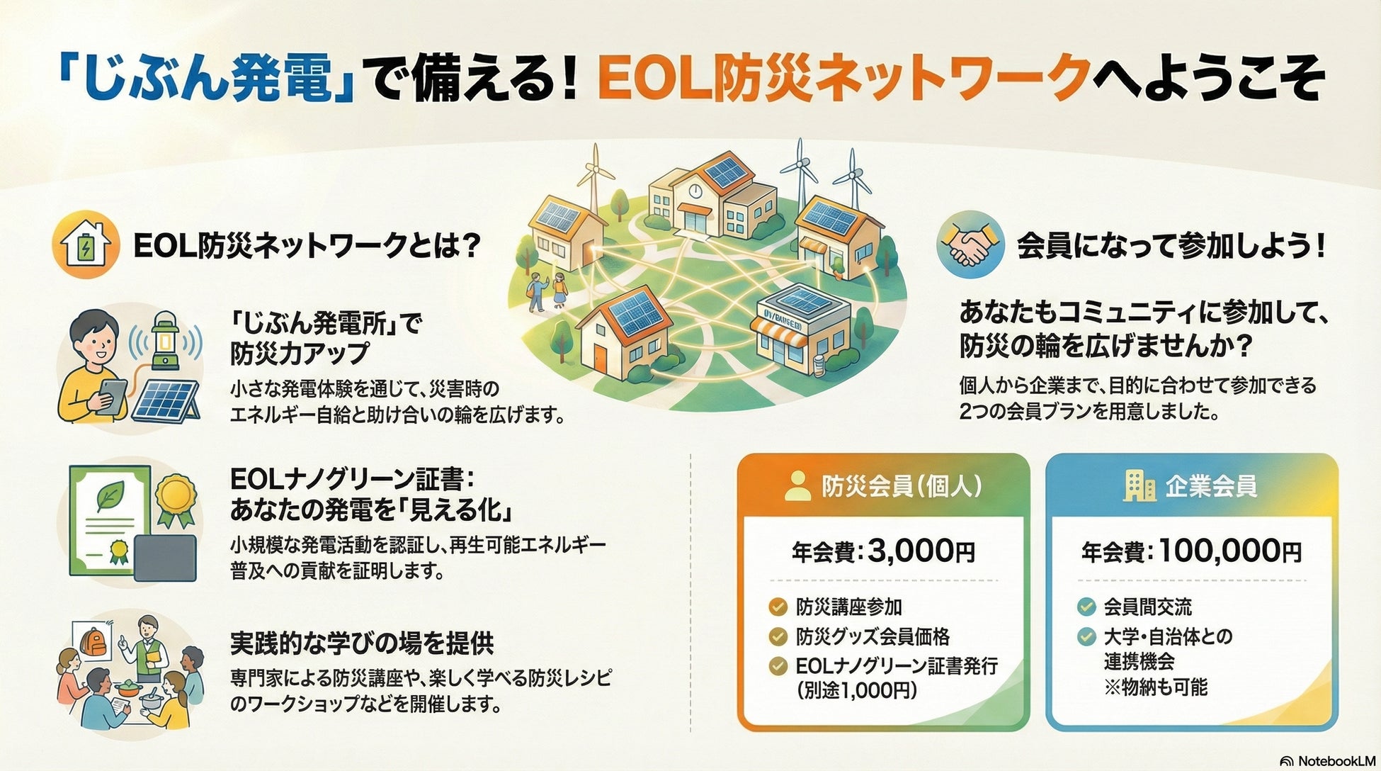 「EOL防災ネットワーク」は、再生可能エネルギーを活かした「未来共存型防災」を学び、支え合う会員制度です。