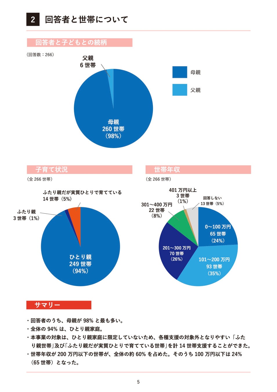 <調査概要> 回答者 : 2024年度事業の受益266世帯の保護者 地域 : 40都道府県(受益者の所在地) 方法 : アンケートを郵送し、自記式の任意回答の上、郵送で返答 回収期間 : 2024年3月7日〜3月31日 回収率 : 100% |