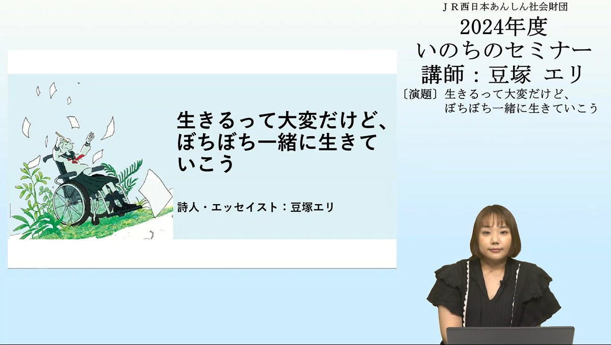 今年度第3回目の「いのちのセミナー」(WEB配信)は、詩人・エッセイストの豆塚 エリ氏を講師にお迎えし、世の中の様々な「生きづらさ」といかに向き合っていけばよいのか、生きていく上での「自分の居場所」や「自分なりの幸せ」をみつけるプロセスなど、ともに考える機会を提供させていただきます。