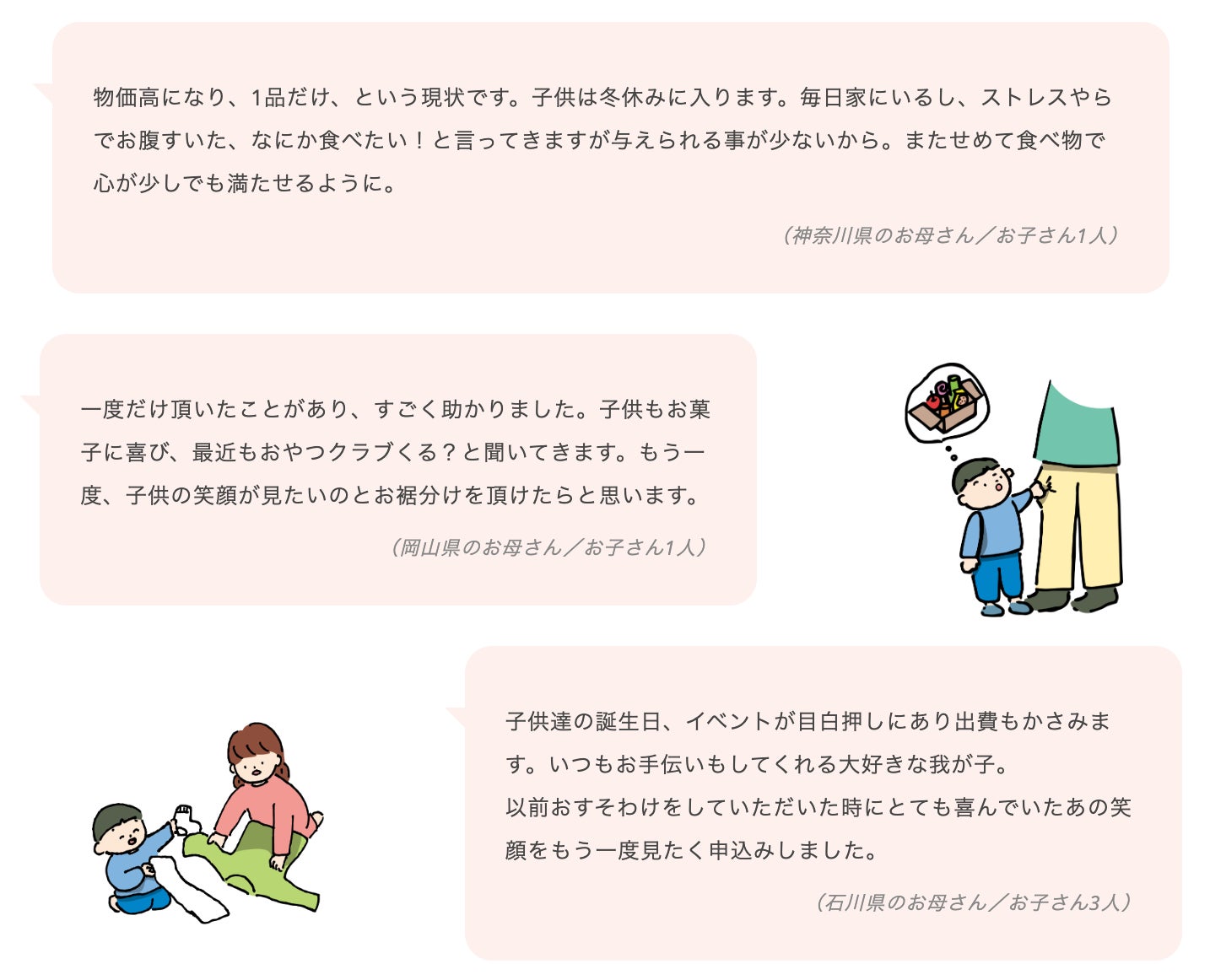 家族みんなが一年の終わりにホッと一息ついてあたたかい歳末を過ごせるよう、昨年に続き今年も「歳末たすけあい」を実施し、それぞれが今できる方法で全国のひとり親家庭を応援します。