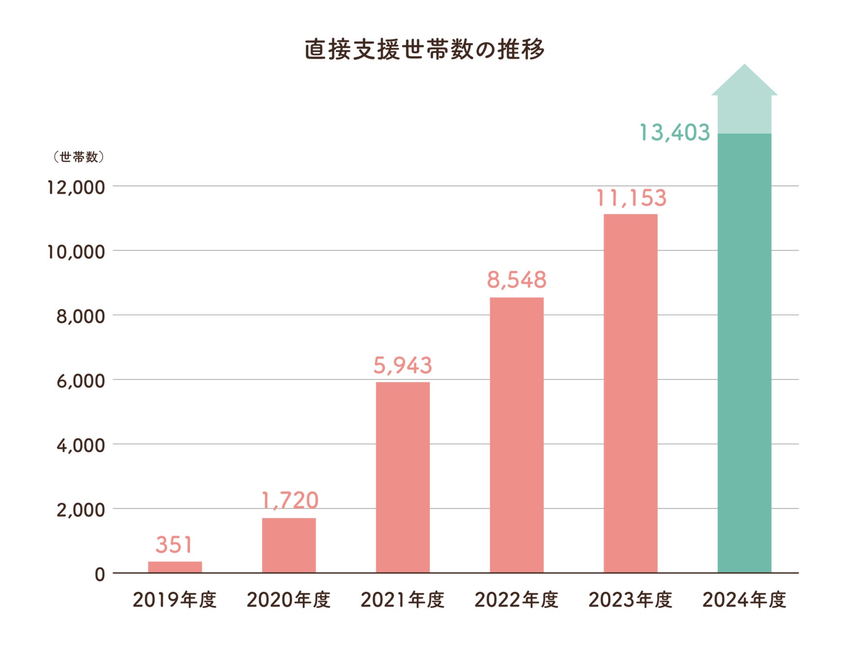 私たちとつながるひとり親家庭は、この10年間で全国13,000世帯となり、2024年度だけで、すでに2,900世帯以上の家庭からの支援要請が寄せられています。日本では貧困家庭は周囲から「見えにくい」と言われている中、困りごとを抱えた家庭の存在が少しずつ「見える」ようになってきました。