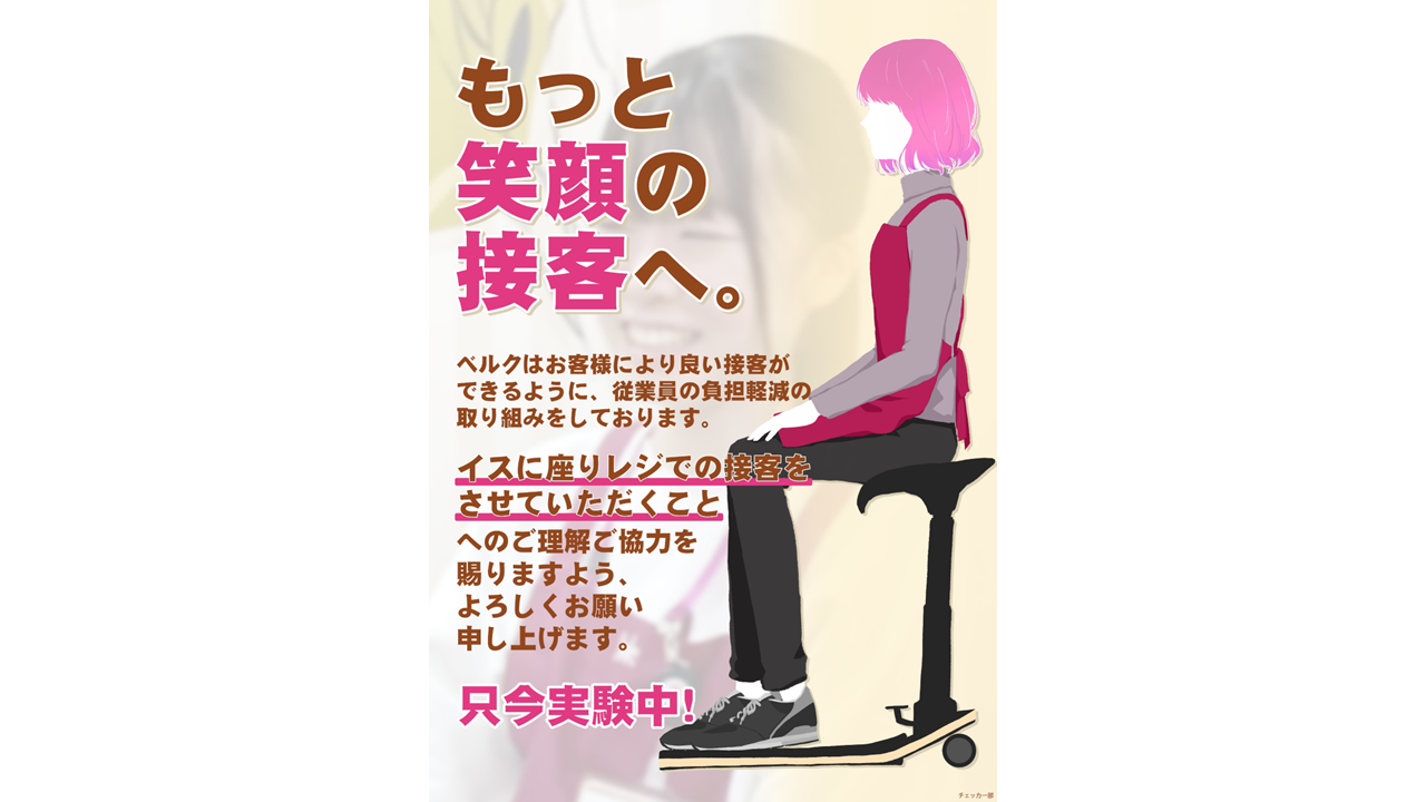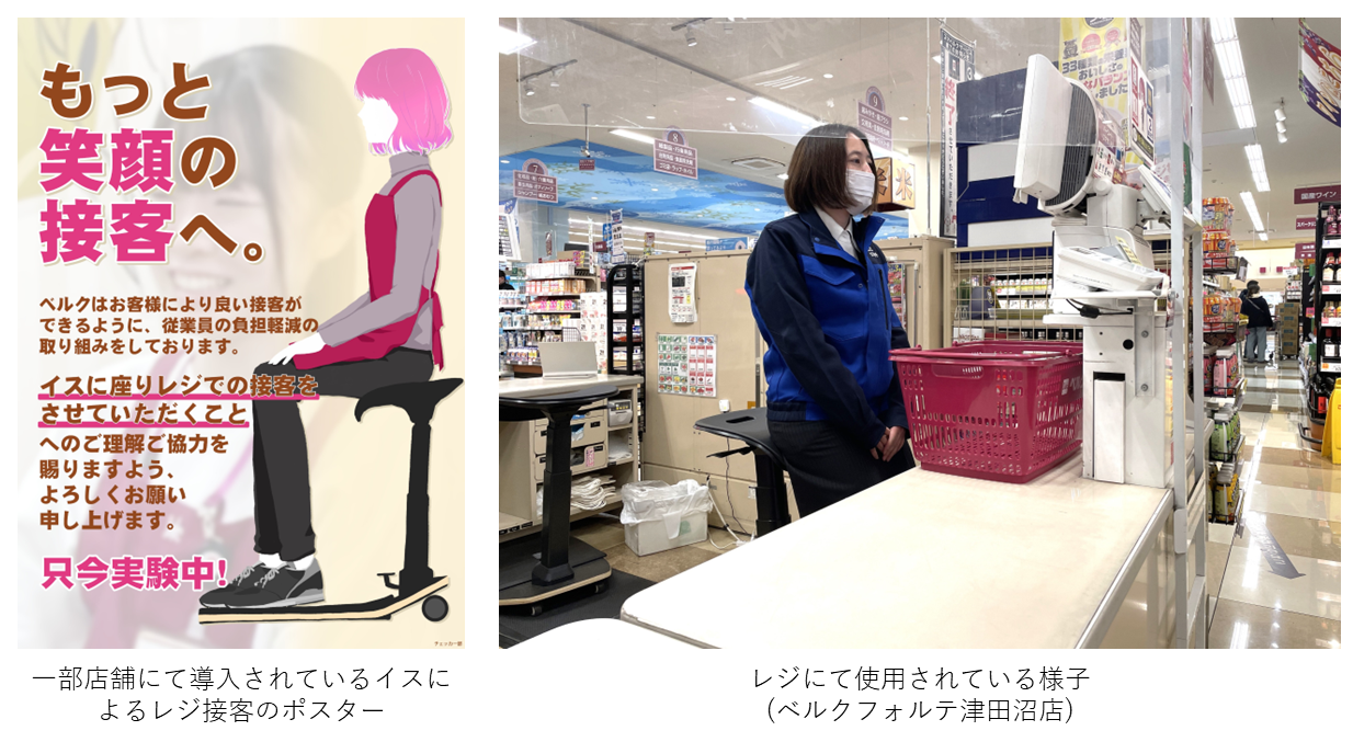 コロナ禍で日本人の働き方や働く人の価値観が大きく変化していく中、今まで当然のように行っていた「立ってレジを打つ」という業務に違和感を感じるようになりました。オランダやイギリス、韓国などの諸外国においては「座ってレジを打つ」ということが”当たり前“かつお客様もそれを受け入れています。ベルクでは「レジ業務は立ち仕事」という固定観念を壊しつつ、座ってレジを打つことによってレジ担当者の身体的・心理的負担が軽減され、笑顔あるより良い接客に繋がることを期待しております。