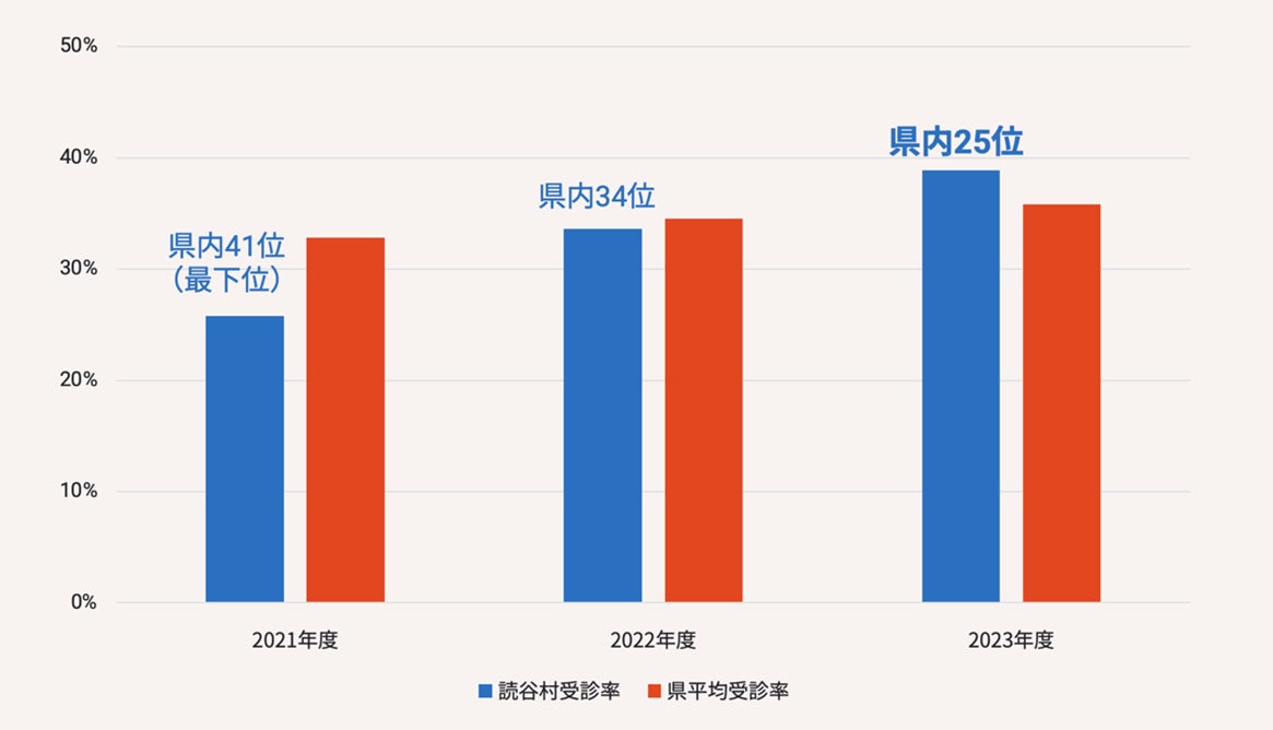 特に、2022年度から取り組んでいる特定健康診査の受診率向上事業では、大きな成果が出ています。2021年度に県内最下位にまで落ち込んでいた受診率が目覚ましく回復し、沖縄県の人口1,000人以上の市町村の中で、2022年度の受診率の前年度比の伸び率が第1位(7.8%ポイント増、沖縄県市町村平均は1.7%ポイント増)、2023年度の前年度比の伸び率は、第2位(5.3%ポイント増、沖縄県市町村平均は1.3%ポイント増)を記録しており(※2)、継続的に成果を出す仕組みを確立しつつあります。