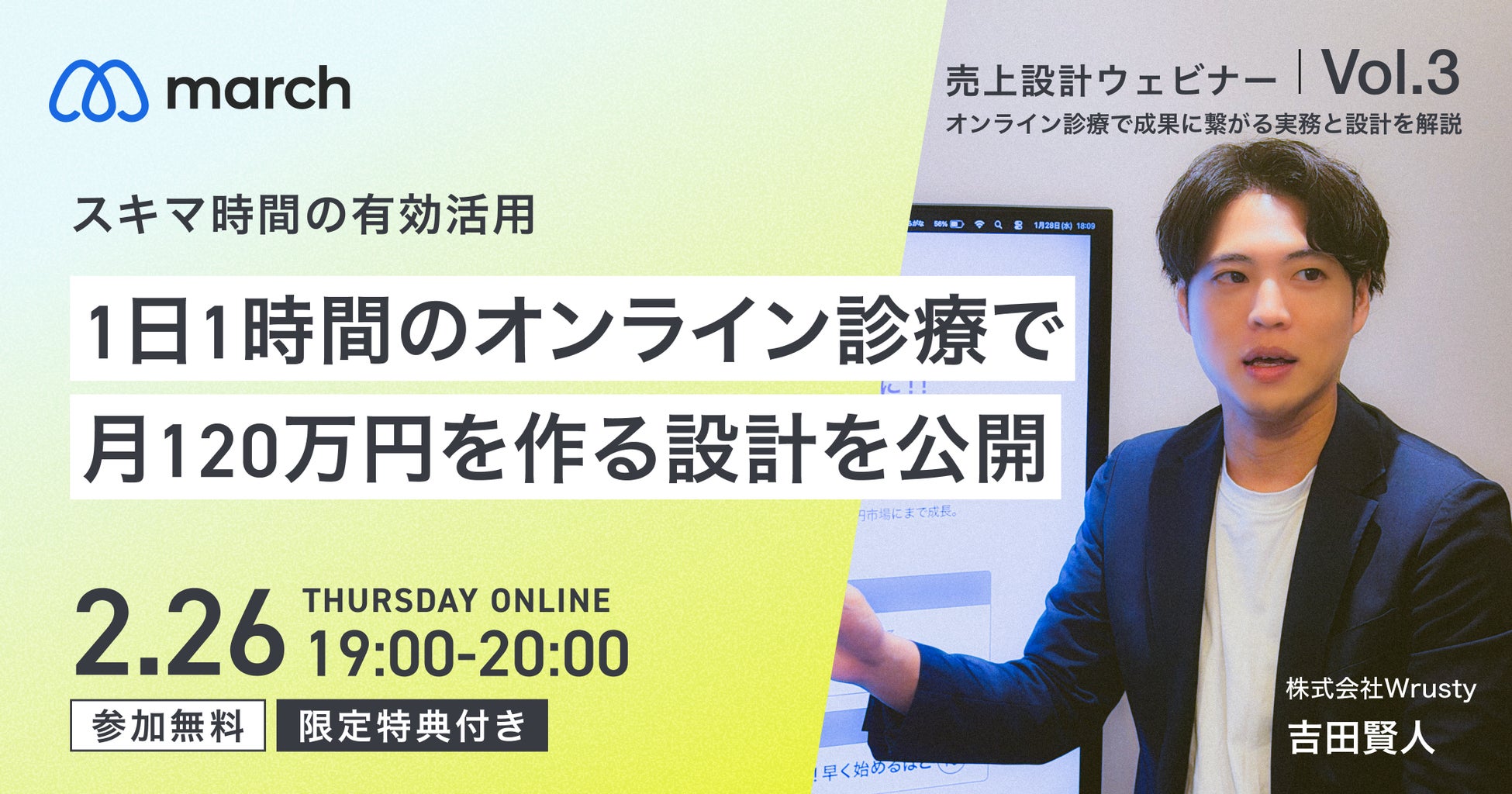 LINEを活用した集患と継続収益まで自動化することで、医療機関の “成果に責任を持つ” オンライン診療・集患オペレーションシステム「march」を展開する株式会社Wrusty(本社:東京都渋谷区、代表取締役:上田遼)は、全国の開業医・開業予定医の皆様を対象に、無料オンラインセミナー「1日1時間のオンライン診療で月120万円を作る設計を公開」を2026年2月26日に開催いたします。本セミナーでは、1日たった1時間のオンライン診療を行うことで、「march」を活用している医療機関は1年間で9倍という収益に繋げることができているかを、再現性の高い設計という観点から解説します。