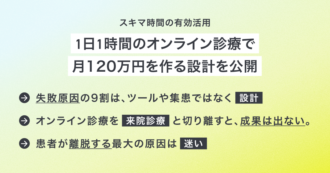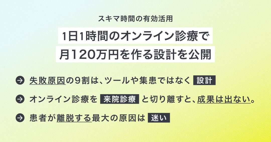 セミナータイトル:「1日1時間のオンライン診療で月120万円を作る設計を公開」