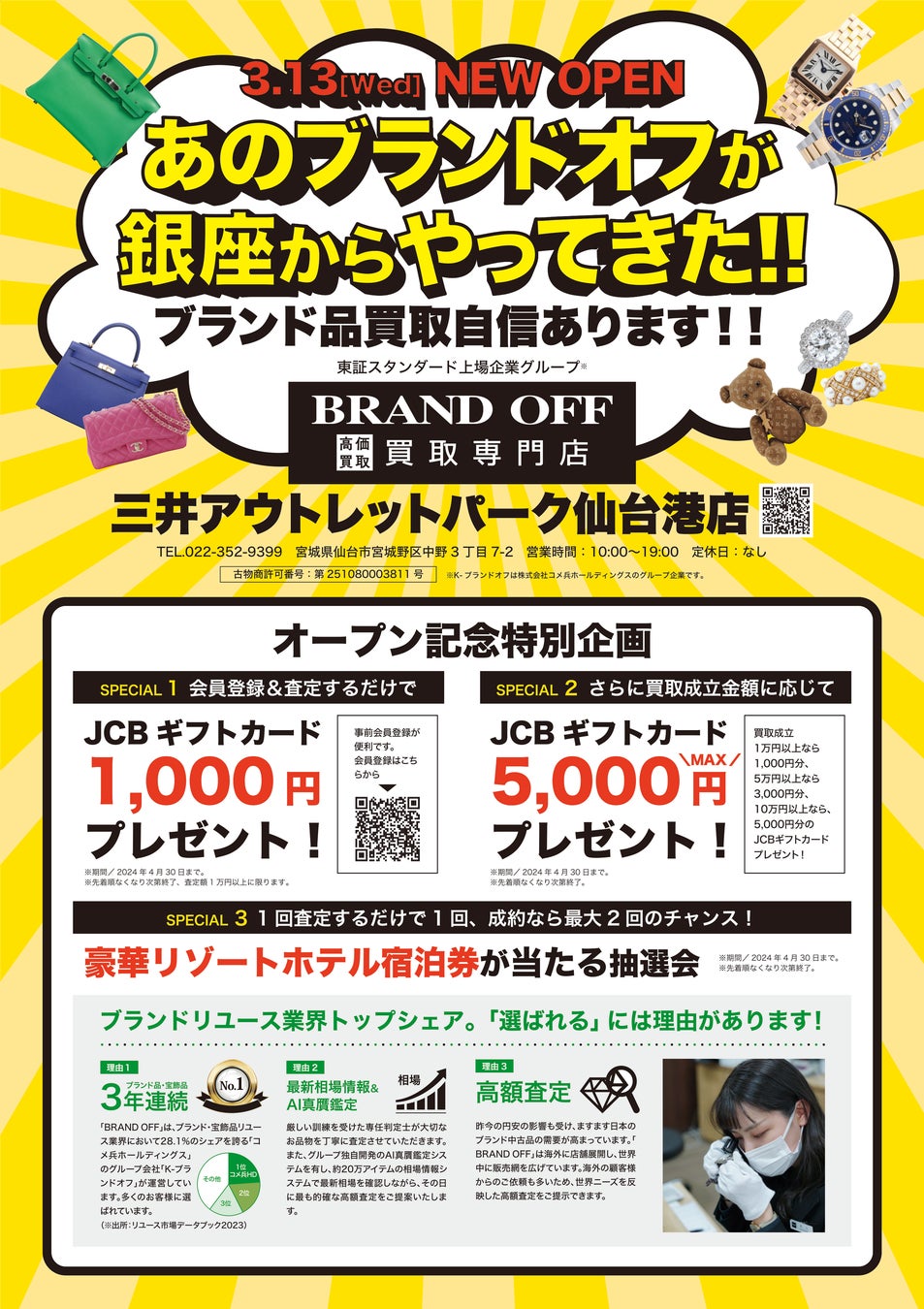 「ブランド買取専門店 BRAND OFF 三井アウトレットパーク仙台港店」が宮城県仙台市に3月13日(水)オープン