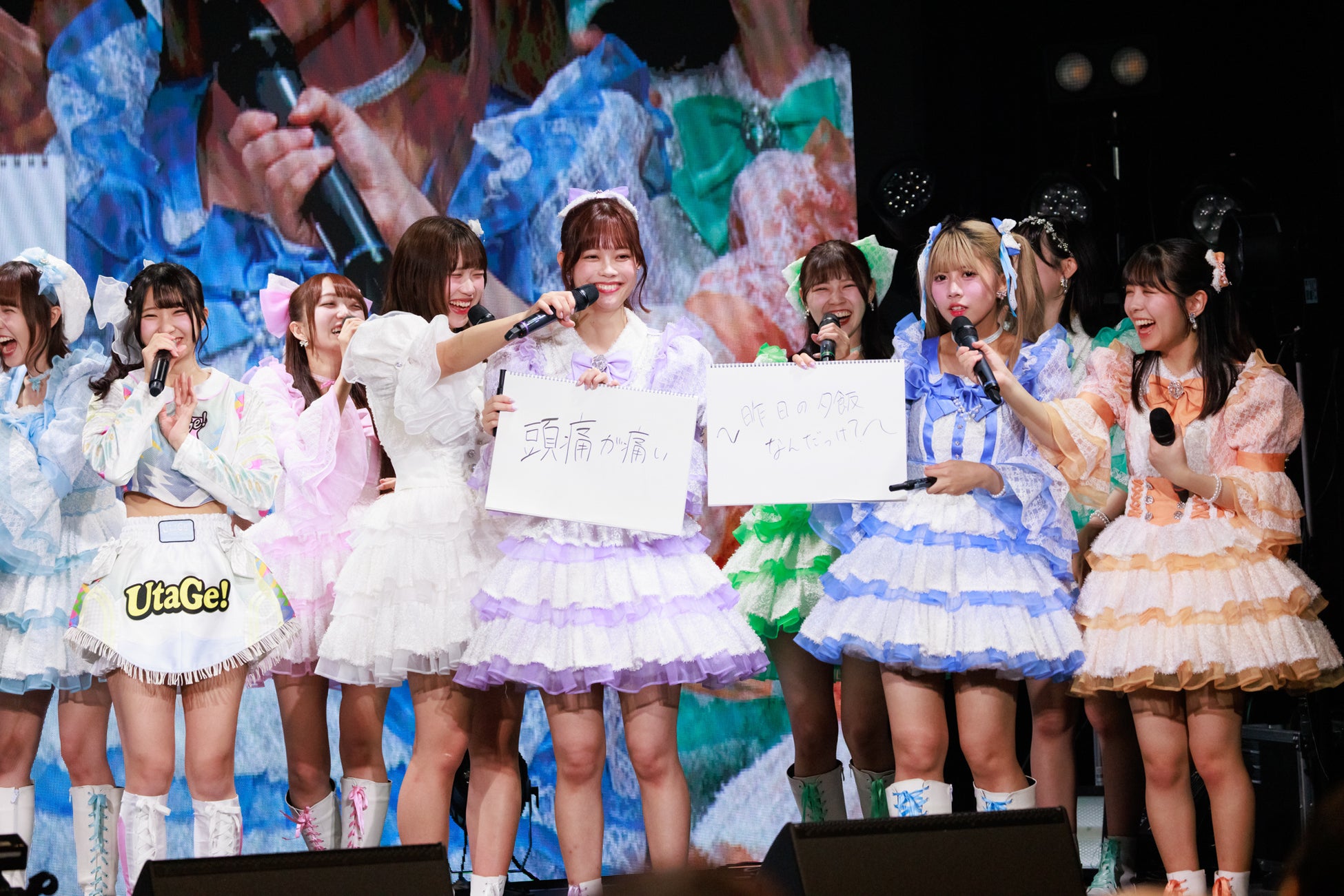 中盤ではこのライブの主軸でもあると言っても過言ではない、ラフ×ラフの主催らしい大喜利対決や、バラエティ番組でお馴染みのゲームによる対戦。勝者は相手メンバーを争奪していくというルール。最終的にはそれぞれが勝ち取ったメンバーが入った、今日しか見れないスペシャルユニットが出来上がり、数分でダンスのフォーメーションを確認。間髪入れずにラフ×ラフとUtaGe!の楽曲を、それぞれのスペシャルユニットで披露し合うという過酷なパフォーマンスに、会場は大盛り上がり。