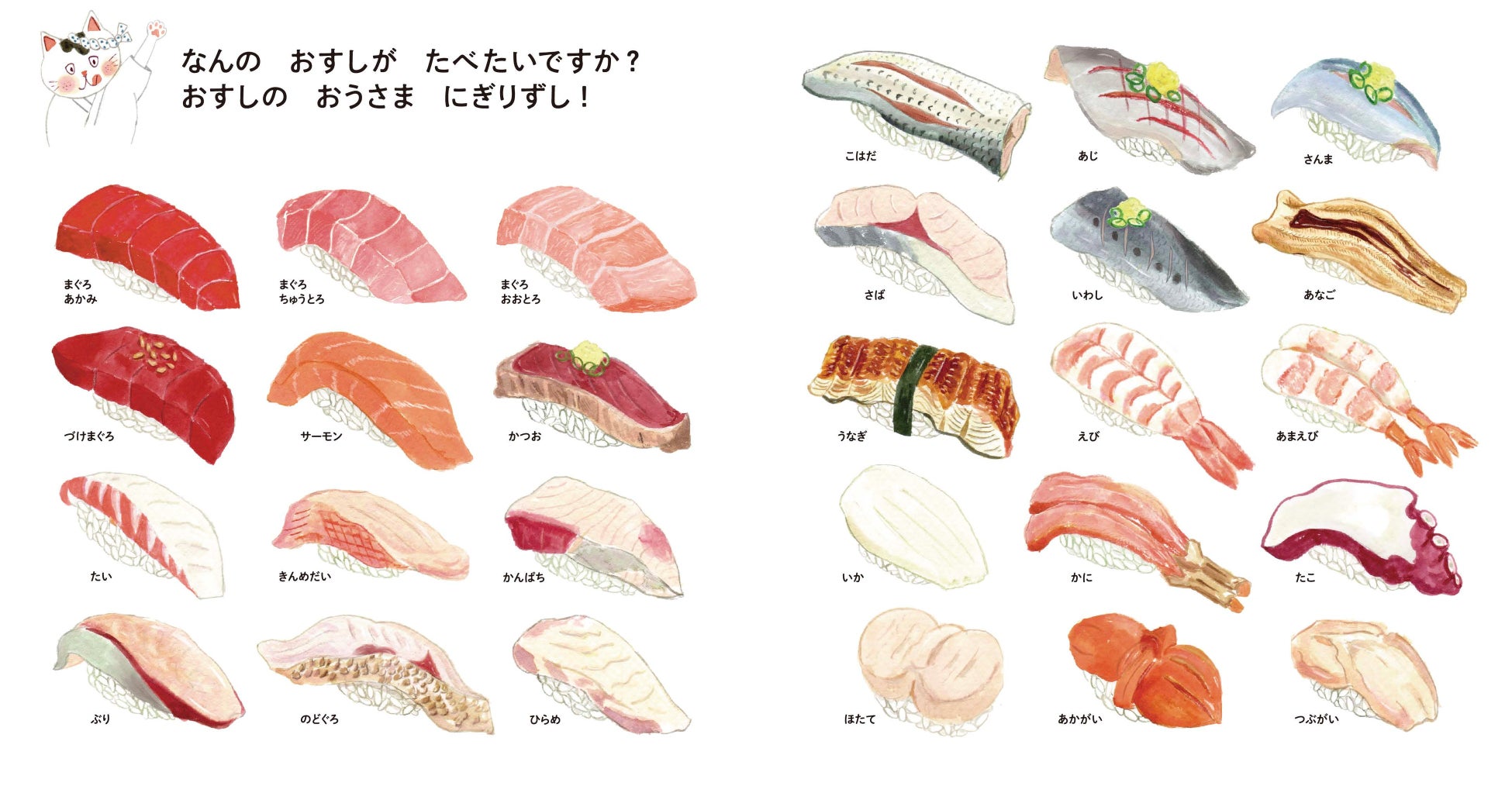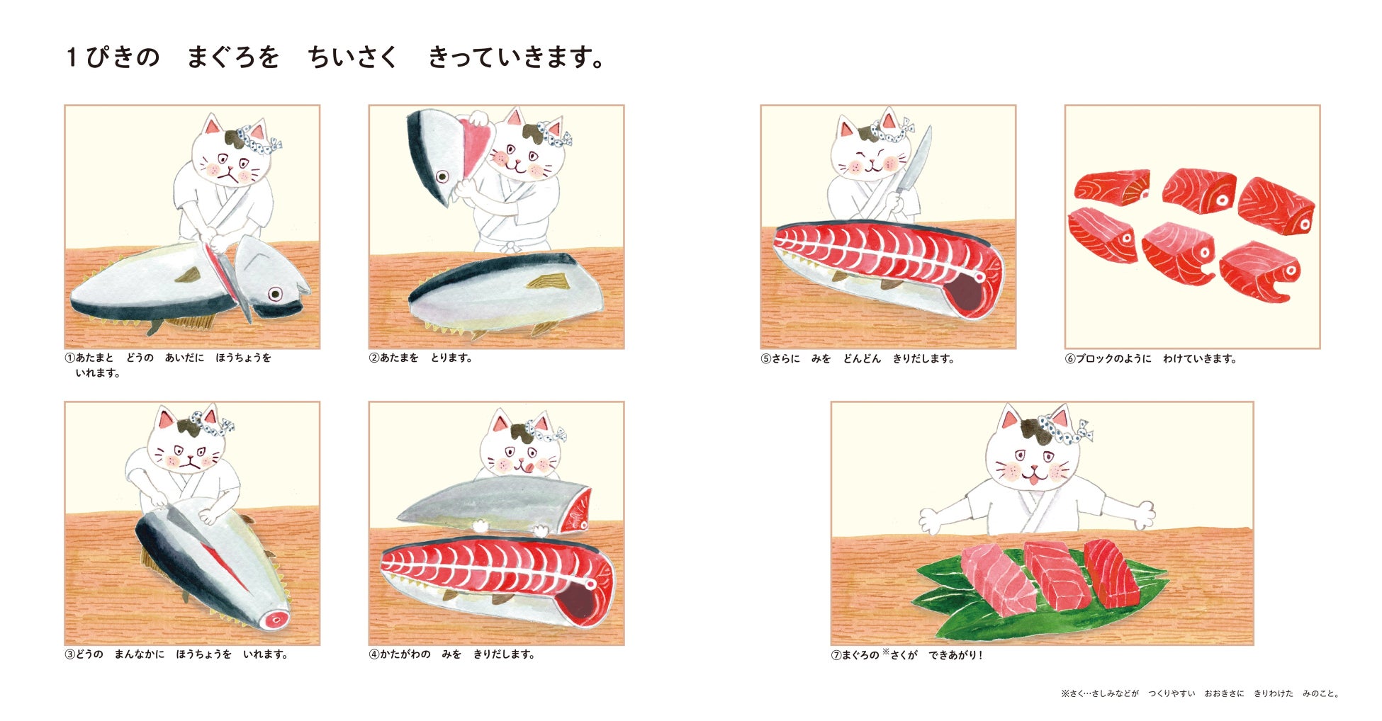 まぐろ、ひらめ、えび、たい、あなご、いか、サーモンなど、丸1匹のお魚を捌いていき、各種様々な工程を経て、シャリと一緒ににぎり、お寿司になる。主人公であるネコの大将が、お魚からお寿司になるまでの工程を可愛いイラストで教えてくれます。以下まぐろは一例。