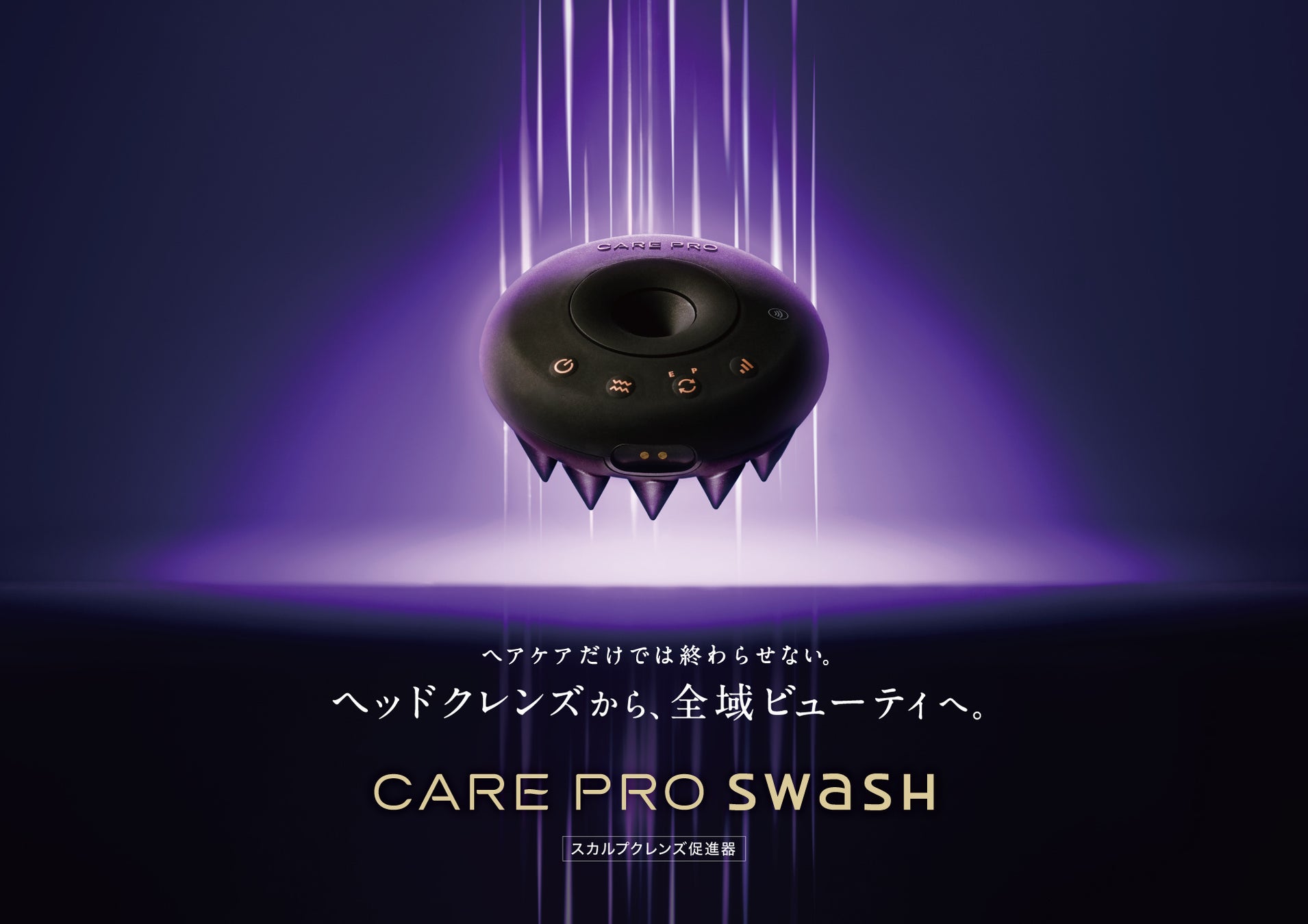 「CARE PRO SWaSH(ケアプロ スワッシュ)」は、クレンジング・浸透促進のWアプローチで、頭皮の汚れをすっきり洗い上げ、美容成分を角質層まで浸透させる“スカルプクレンズ促進器”。