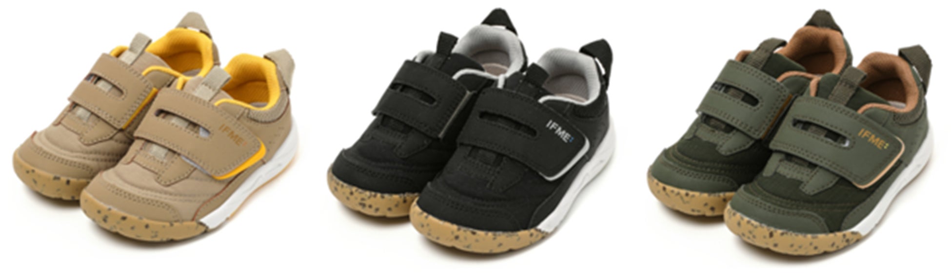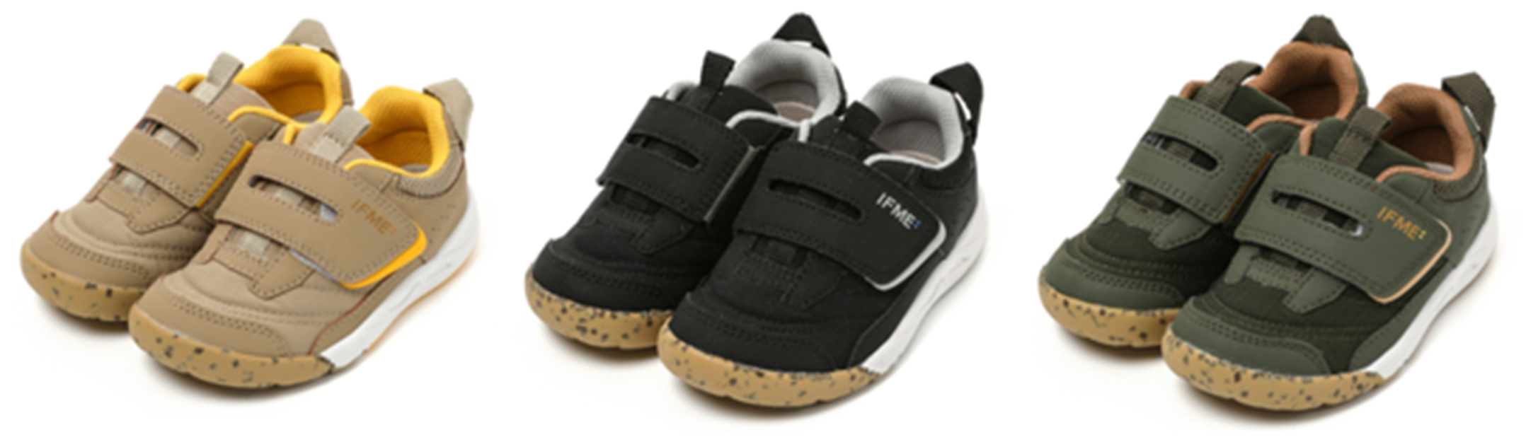 また、ジュニアシューズは、靴紐風デザインのスリッポンタイプとなっているため、大人のスニーカーのようなカッコいいデザインはそのままに、紐がほどけて怪我をするなどの心配はありません。さらに、IFME独自の「アウトサイドストラップ」を採用し、脱ぎ履きしやすい工夫を施しています。