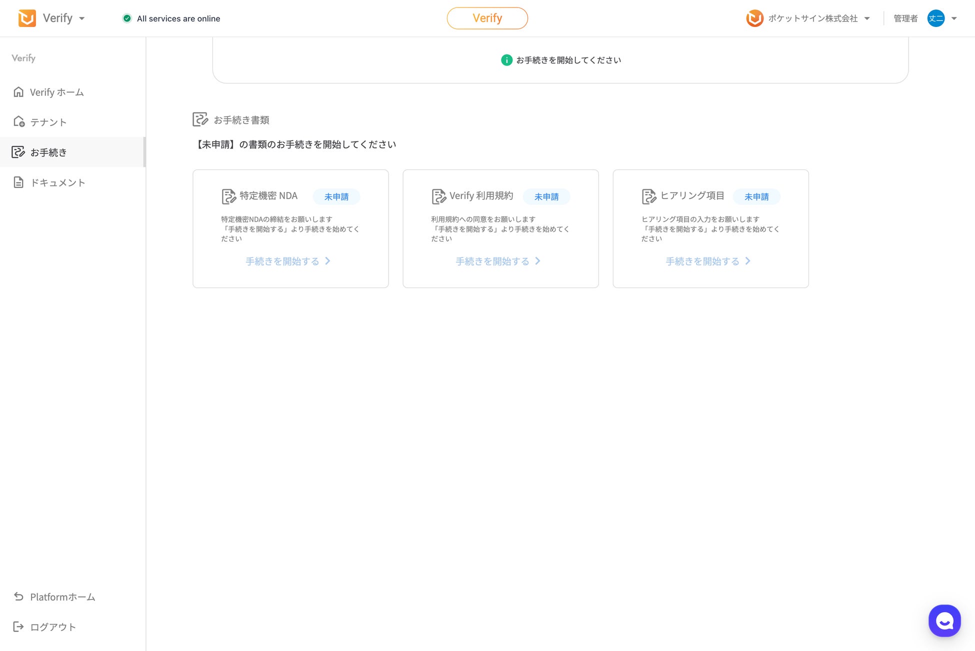 「PocketSign Verify」に新たに「お手続き」機能が追加されました。これまで、ご利用開始時や、開発環境のアップデートの際に、当社の担当営業と対人のやりとりをしていただいていた契約書の同意や締結についてのお手続きが、「お手続き」機能の追加によって、オンライン上で完結できるようになりました。利用規約の同意や、秘密保持契約の締結に対応しているほか、JPKI(公的個人認証サービス)をご利用いただくために、公的機関に対して当社が代理申請を行う際に必要なヒアリング項目の入力についても、オンライン上でご対応を完了いただけるようになりました。
