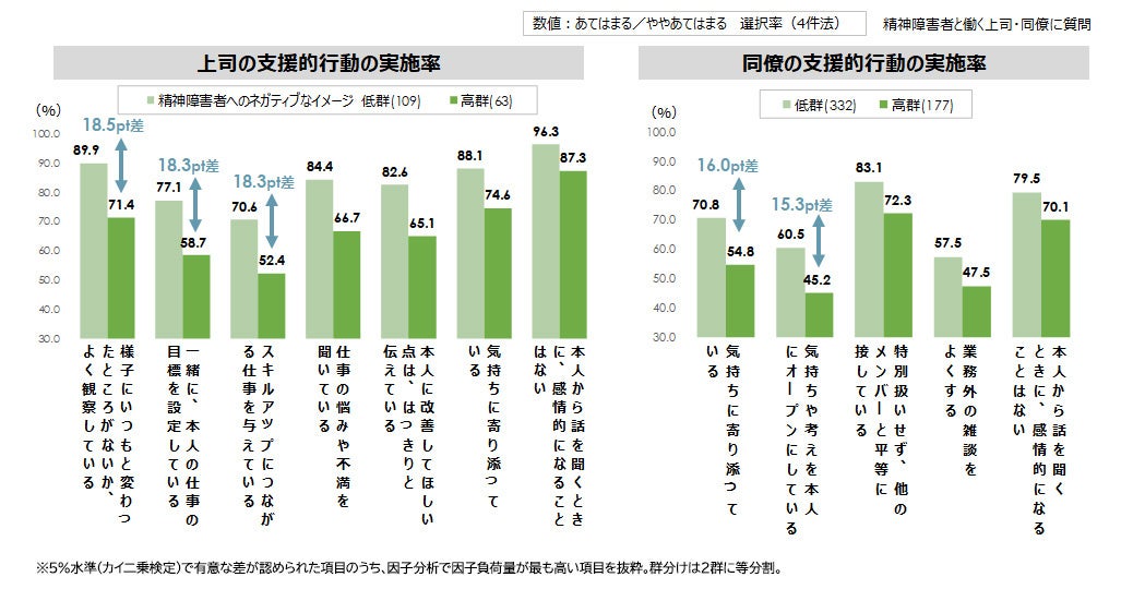 精神障害者にネガティブなイメージを持つ上司・同僚は、本人への支援的な行動をとらない傾向があることが分かる。