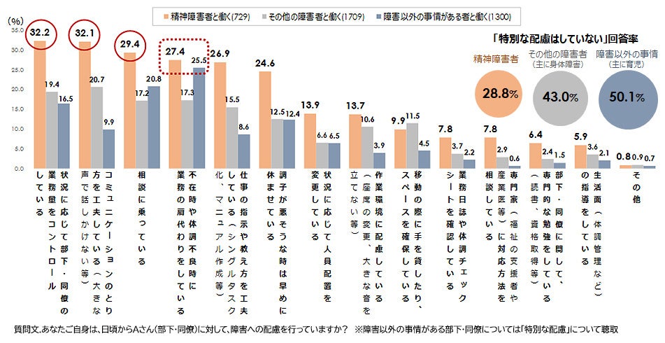 6. 精神障害者と働く上司・同僚に、本人の障害への配慮ついて尋ねた。上司・同僚の約3割が「業務量のコントロール」「コミュニケーションの工夫」「相談に乗る」といった配慮を実施。「不在時等の業務の肩代わり」の実施は4人に1人で、障害以外の事情(主に育児)と実施率が同程度。