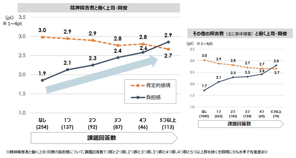 受け入れの課題が多くなるほど、上司・同僚の負担感は増大。肯定的な感情は、ゆるやかに減少する。その他の障害者と働く上司・同僚についても、同様の傾向が確認された。