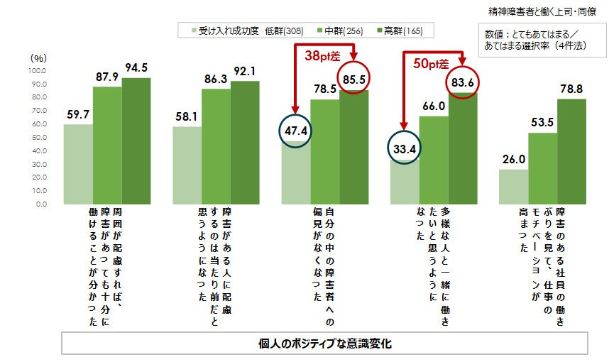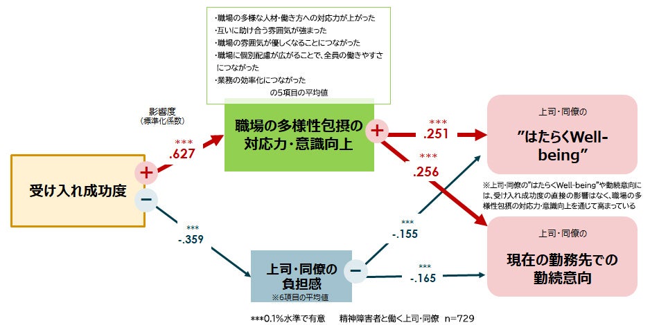 2. 一方で、精神障害のある部下・同僚が職場にいることによって偏見の解消や多様性包摂意識の醸成といったポジティブな波及効果を得るには、受け入れの成功※が前提条件となっていた。