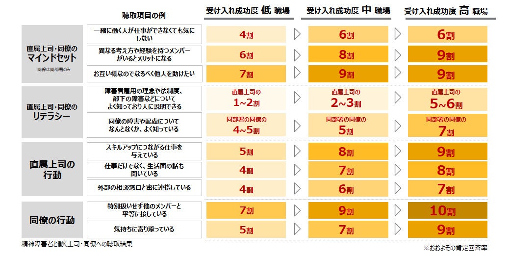 3. 精神障害のある従業員の受け入れに成功している職場ほど、直属上司および同僚が、ダイバーシティや助け合いに肯定的なマインドセットや障害者雇用についてのリテラシーを持っており、直属上司のエンパワーメント(部下の能力開花)、同僚の平等な対応といった支援的な行動をとっている。