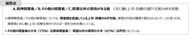 本調査から、精神障害のある従業員と共に働く上司・同僚の負担感は、上司・同僚自身の“はたらくWell-being”を低下させ離職意向を高めるだけでなく、精神障害者全体に対するネガティブなイメージを強化し、受け入れをさらに困難にしていた。これまでもマタハラ等の問題で、負担を感じた周囲の不満の矛先が、マネジメント側ではなく産休・育休を取得する本人に向くことが指摘されてきた※1。精神障害のある従業員の受け入れでは、周囲の負担が大きくなりやすいのが現状だが、これを軽減する職場の体制整備が必要だ。