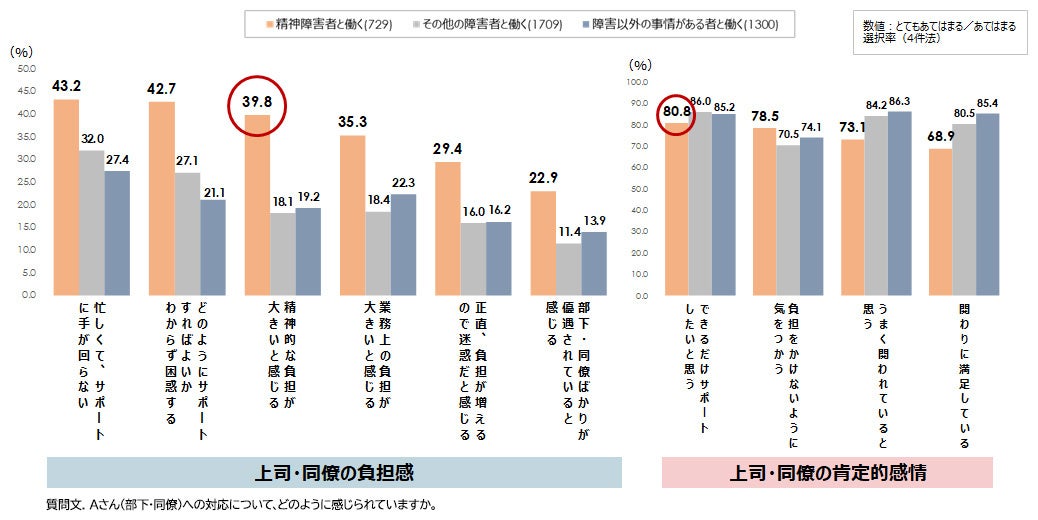 4. 精神障害者と働く上司・同僚の約4割は、「精神的な負担が大きいと感じる」と回答。その他の障害や障害以外の事情がある部下・同僚と比べ、受け入れの負担を感じている割合が高い。他方で、「できるだけサポートしたい」「負担をかけないよう気をつかう」といった肯定的感情も約8割と高い。