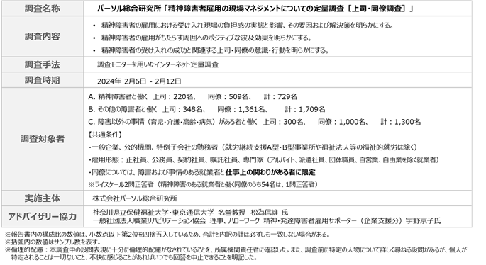 同テーマで2回目となる今回の調査では、精神障害のある従業員と共に働く上司・同僚へのアンケート調査を実施し、その実態や課題を明らかにすることで、精神障害者と、共に働く上司や同僚の双方が長く安定的に活躍できる環境を整えるための基礎データとして活用されることを目的として実施いたしました。