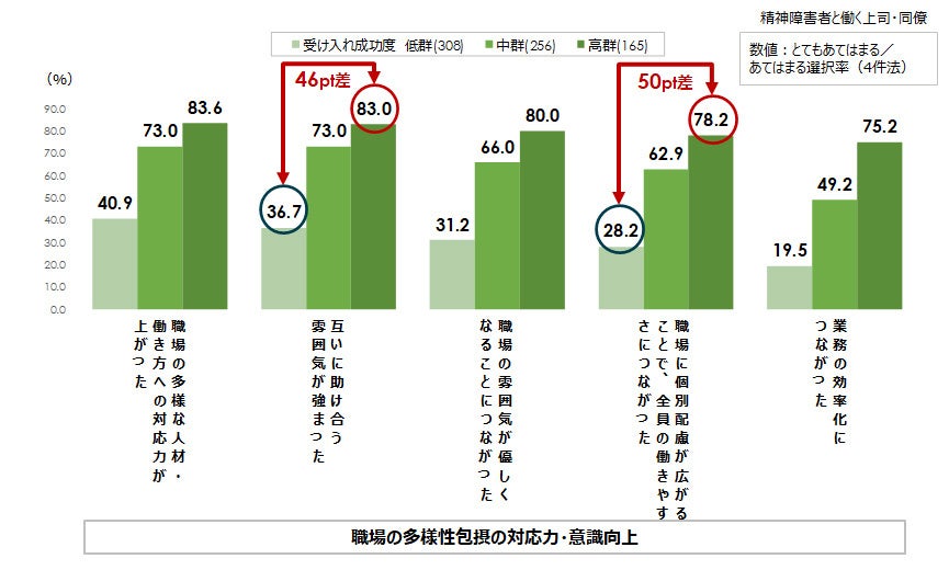 2. 一方で、精神障害のある部下・同僚が職場にいることによって偏見の解消や多様性包摂の対応力・意識向上といったポジティブな波及効果を得るには、受け入れの成功が前提条件となっていた。精神障害者の受け入れ成功度が低い群では、「障害者への偏見がなくなった」は半数未満、「多様な人と働きたくなった」は約3割と少ないが、受け入れ成功度が高い群では、いずれも約8割~9割が実感。
