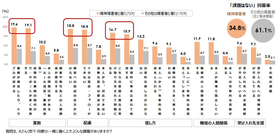 8. 精神障害のある従業員と働く上司・同僚の2割弱が、「業務の遅延・トラブル」「意図と異なる受け取り方をされる」「配慮の仕方がわからない」といった課題があると回答。