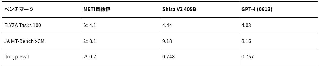 今回開発したShisa V2 405Bは、経済産業省が設定した主要な日本語ベンチマーク指標をすべて大幅に上回りました。また、日本語・英語の主要な評価項目においてGPT-4およびGPT-4 Turboを超える性能を示しました。
