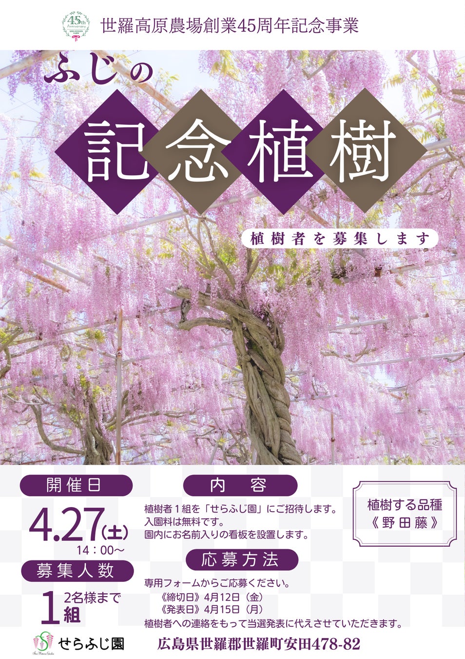 世羅高原農場創業45周年を記念して、せらふじ園にてふじの記念植樹を行います。植樹を行う方を1組募集し、せらふじ園にご招待いたします。