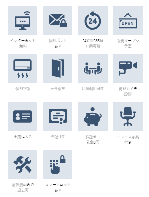 2.1名から気軽に利用できる完全個室オフィスを16室展開! 清潔感のある快適な完全個室のオフィスをでご利用いただけます。 オフィス家具・インターネットも完備! (別途電気代が必要) 退去時も清掃費のみで、変化するビジネスをバックアップします! 3.住所利用・登記可能が無料で各種認可・免許も安心! 「定期建物賃貸借契約」の契約形態で、住所利用・登記が無料です。 各種免許・認可や融資の申請もできるオフィスです。 4.駅前でコンビニもすぐそば! 徒歩2分の距離にコンビニエンスストアもあり、ちょっとした買い物にも とても便利! |