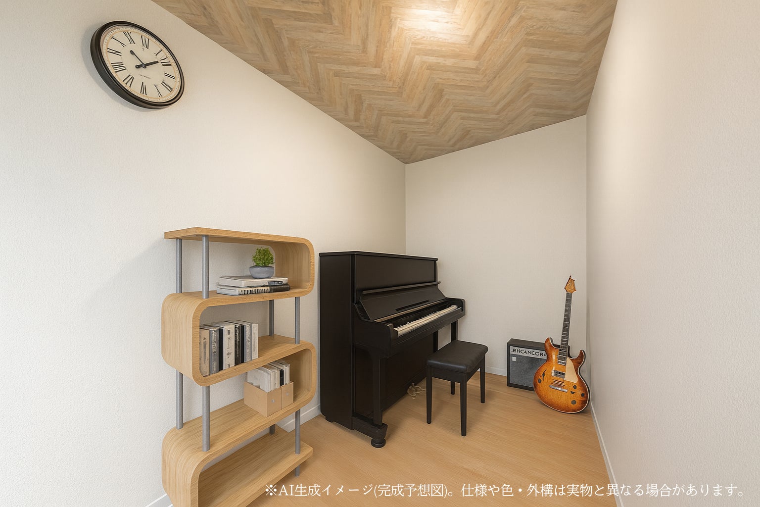 3.5帖の簡易防音室を完備した平屋。音楽・勉強・シアタールームなどライフスタイルに合わせて活躍します。パントリーやウォークインクローゼットなど、使い勝手の良い豊富な収納スペースも魅力です。