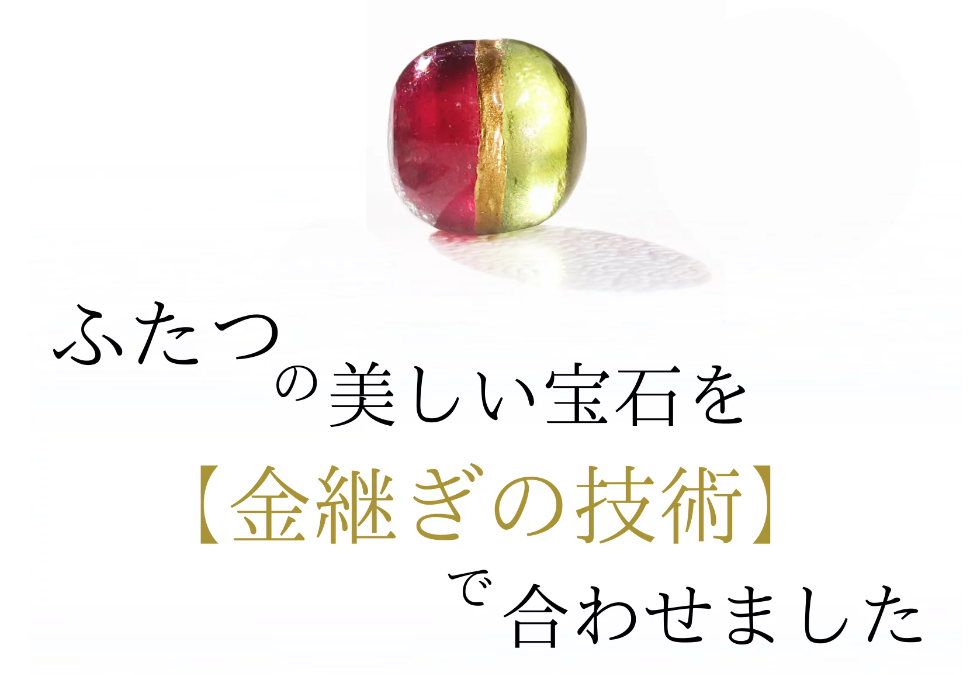 “2色珠”は、天然の宝石を金継ぎの技術で接着した異なる2色の宝石。