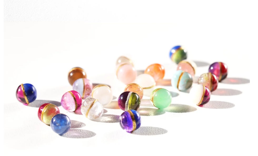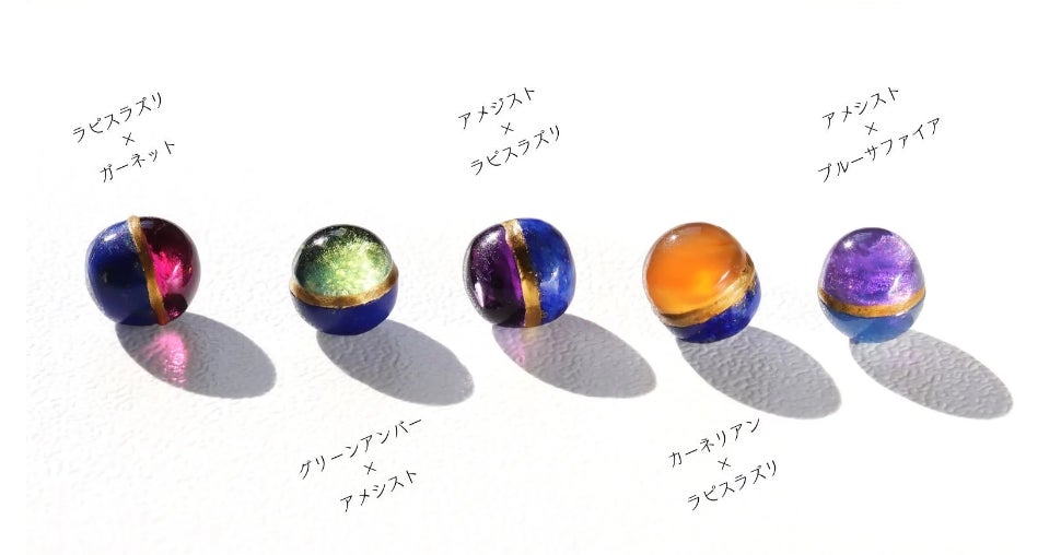今回の“2色珠”は、30種類の天然石をご用意して「金継ぎ」「銀継ぎ」の技術を用いて、まるでお菓子のような可愛らしくて美しい、バイカラーの宝石を作りました。