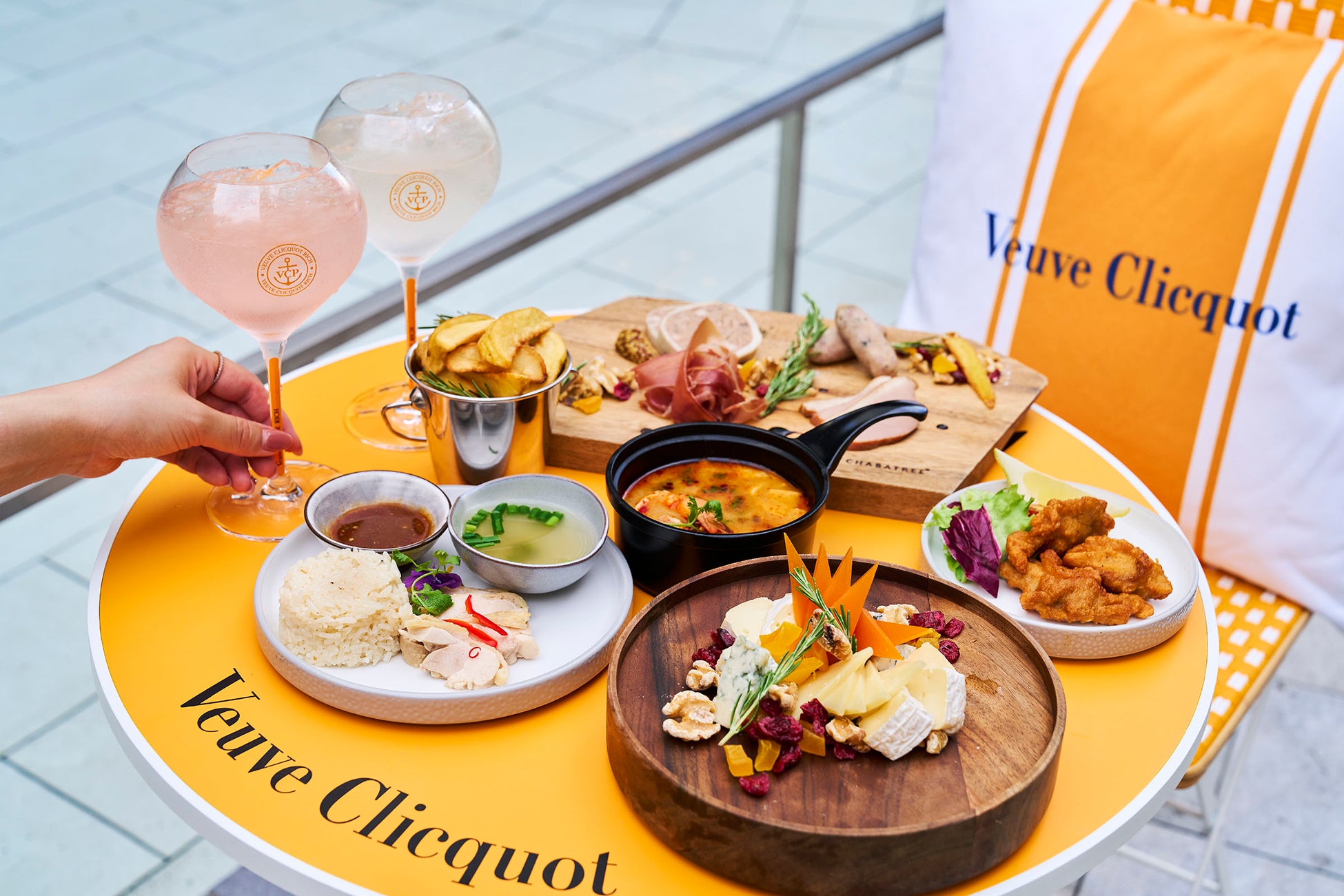 このポップアップテラスの主役である「ヴーヴ・クリコ リッチ オン アイス」および「ヴーヴ・クリコ リッチ ロゼ オン アイス」はボトル以外にバイザグラスでもお楽しみいただけ、氷を浮かべやすいワイドなフォルムの専用グラスでご提供いたします。他にもビールやカクテル、ソフトドリンクなど、お好みに合わせてお選びいただけるドリンクメニューをご用意。フードは、シャンパーニュに合わせて気軽にお楽しみいただける小皿スタイルで、カプレーゼやチーズ盛り合わせ、マッシュルームとパンチェッタのアヒージョやパテ・ド・カンパーニュ、またトムヤムクンやカオマンガイなどタイ発のセンタラならではのタイ料理もあり、暑い夏でも食欲をそそられるシェフこだわりのラインナップでお届けします。▶メニュー詳細