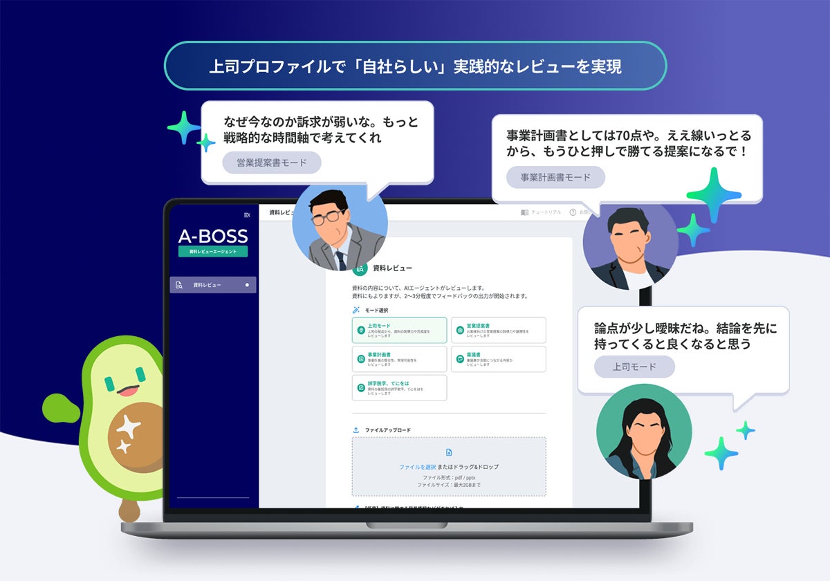 資料の目的に応じ、「上司モード」「営業提案書モード」「稟議書モード」など、最適なAIを選択してレビューを開始できます 。